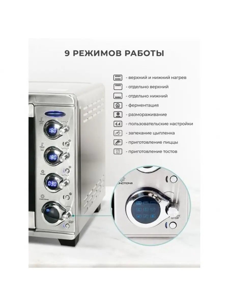 Гриль есть, но подходит разве что, для куриного шашлычка все что тяжелей стонет и дергается так, как будто жить ему осталось еще минуту. Покрытие нержавейка это красиво, Но такой толщины что можно при желании пальцем проткнуть, прогнуть ладошкой особенно на моделях начиная с 40л. Дисплей и удобное управление, да, Но с самыми дешевыми комплектующими , если готовить что то с активным испарением печь сама переставит настройки температуры потому что, что то внутри замыкает на контактах кнопок, писк при переключении громкий и очень китайский. Температуру можно поставить и с верху и с низу. НО фактическая температура будет плясать +-20 градусов, и никогда не совпадет с тем что на дисплее. по факту максимальная температура печки 205 градусов, из за высоких теплопотерь до 230 ее не разогреть. |