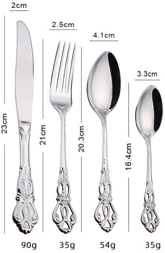 | В набор входит | Подарочная коробка- 1 шт. Нож- 6 шт. Вилка- 6 шт. Ложка столовая- 6 шт. Ложка чайная- 6 шт. |