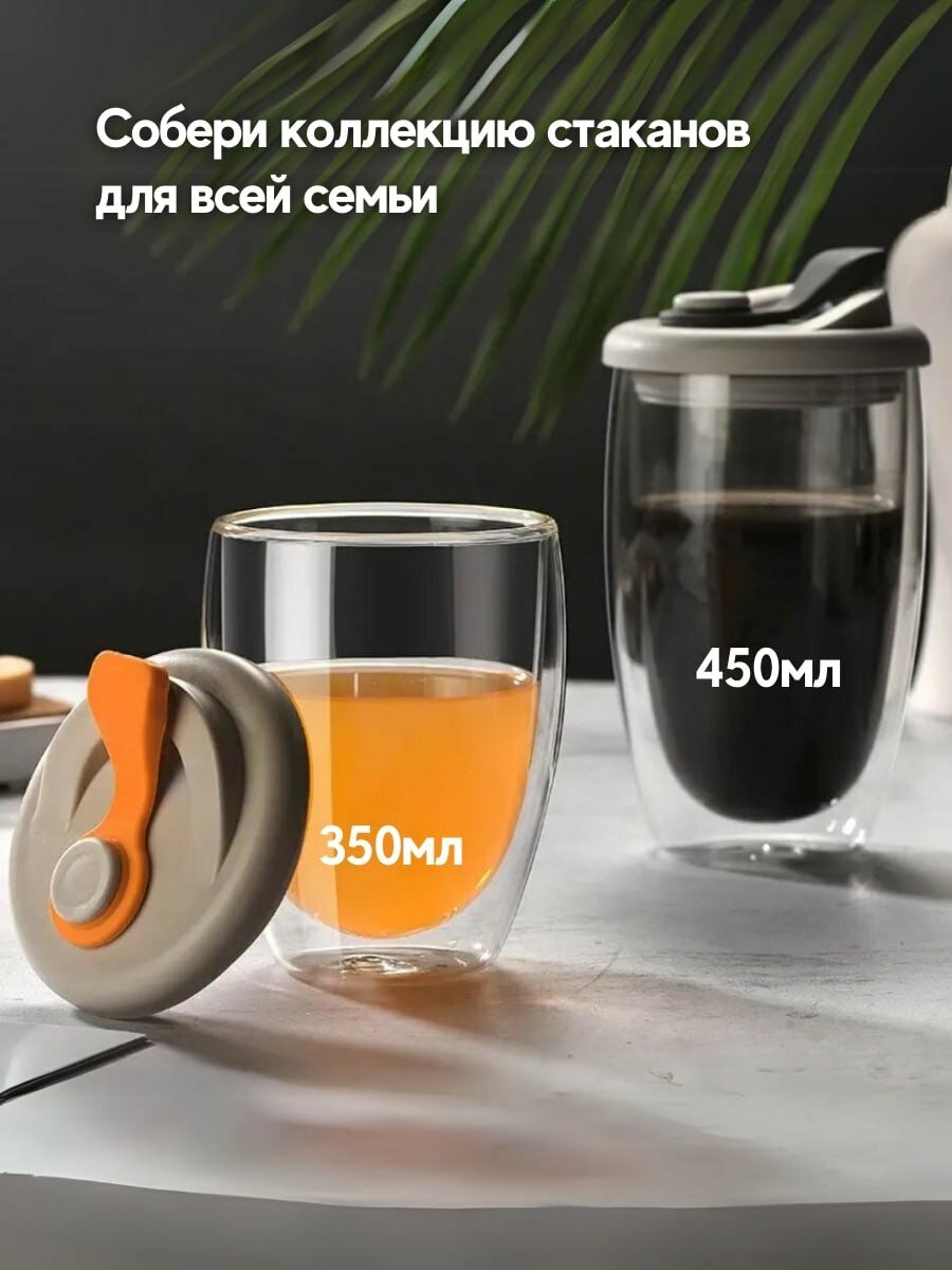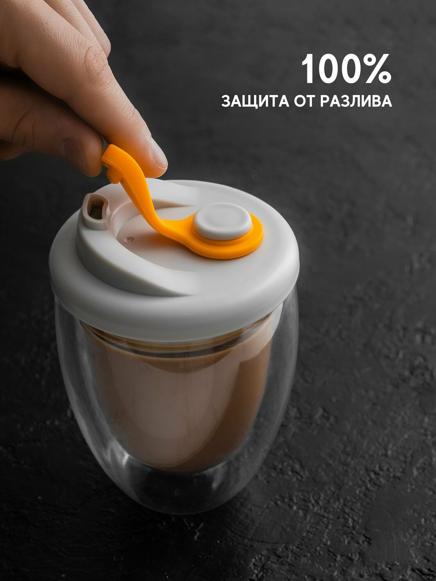 Термокружка с крышкой, термостакан для кофе, непроливайка, стакан стеклянный с двойными стенками для холодных и горячих напитков 350мл оранжевый носик