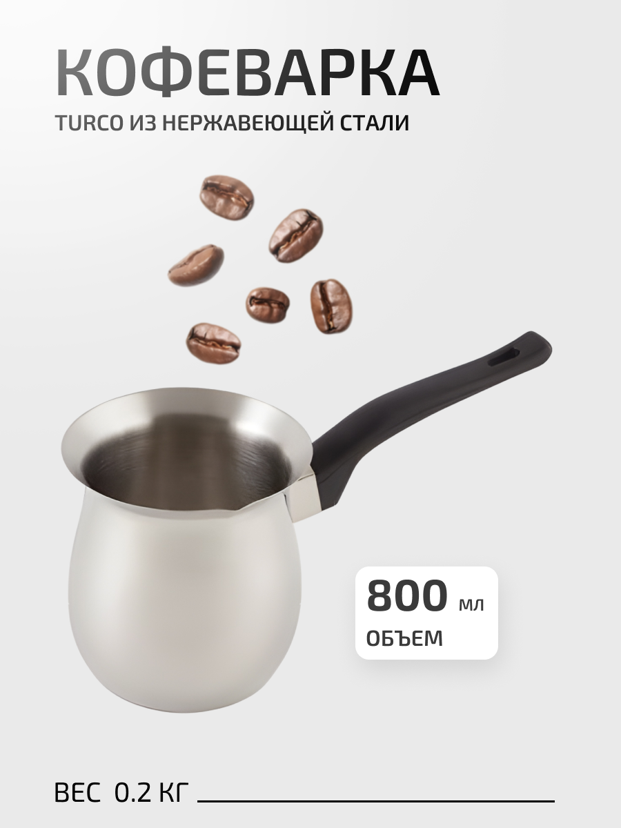 | Комплектация | Кофеварка/турка TURCO 800мл из нержавеющей стали с бакелитовой ручкой |