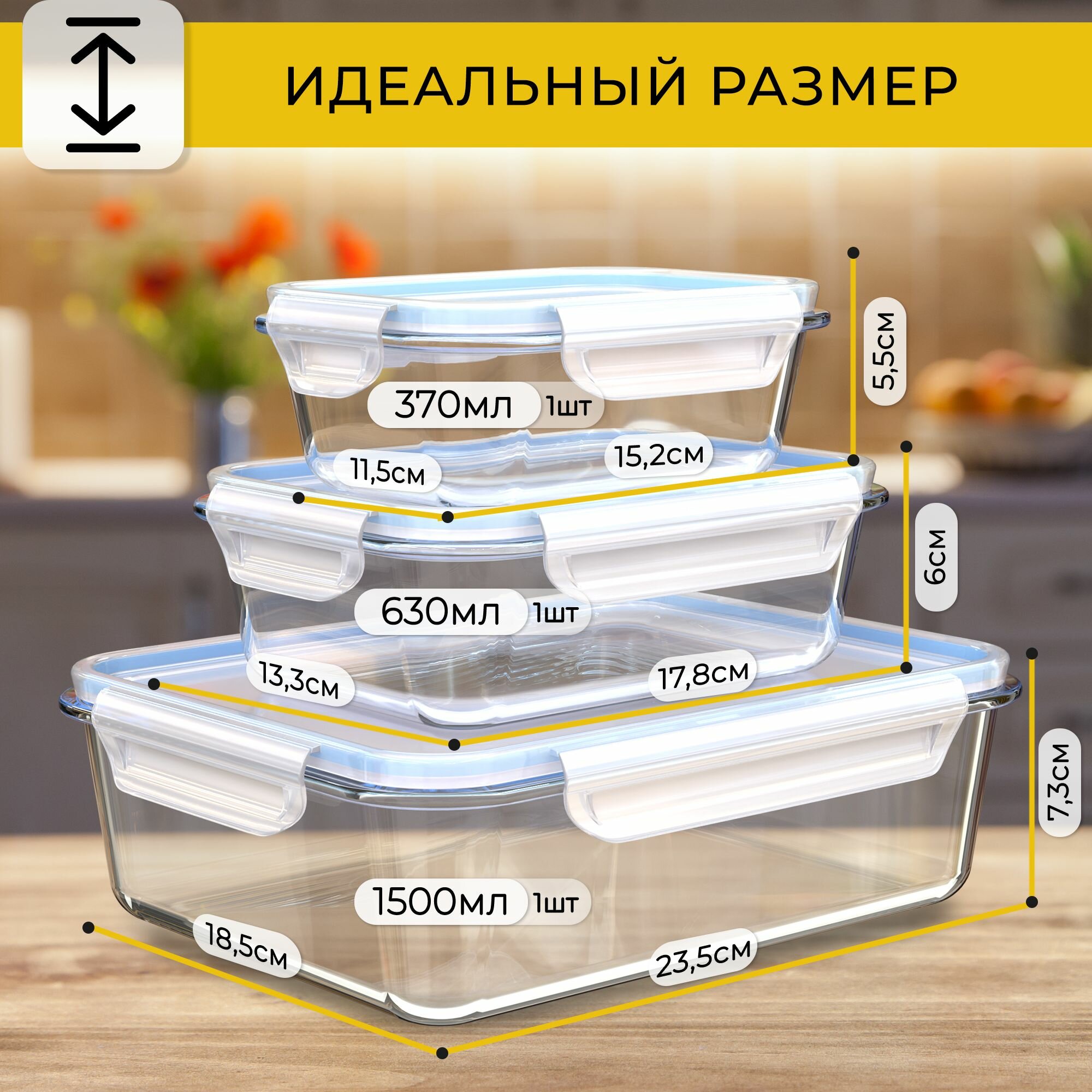 | Комплектация | 3 контейнера: 1 штука 370мл, 1 штука 630мл, 1 штука 1500мл. |