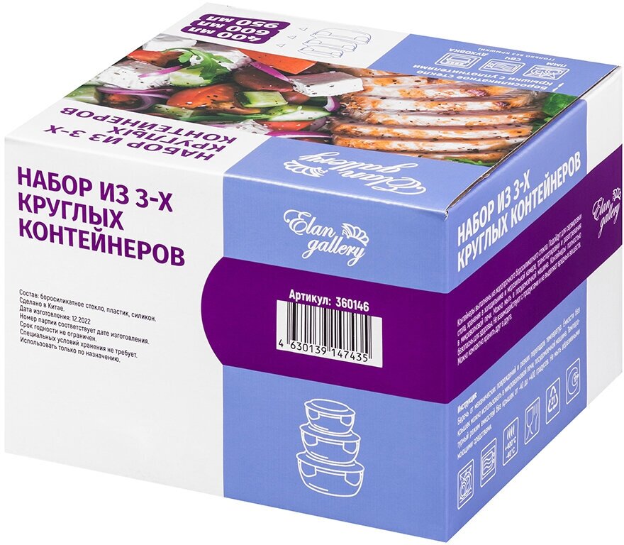 Купить Контейнер круглый / для хранения / для запекания 360 мл, 600 мл, 1000 мл Elan Gallery с пластиковыми крышками 3 шт