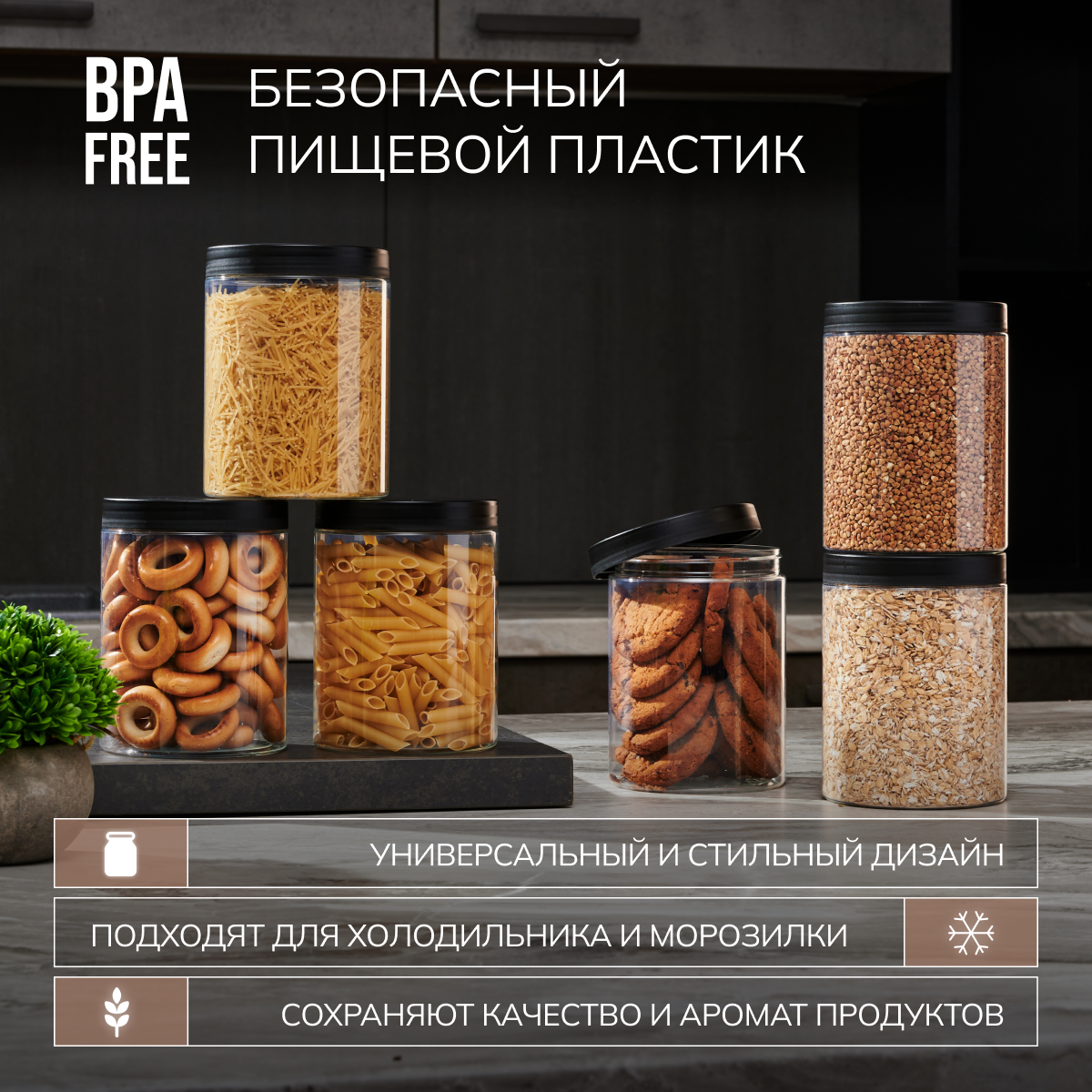 | Дополнительная информация | Набор контейнеров для хранения сыпучих продуктов. Баночки позволят убрать визуальный шум , а также вы всегда будете знать какой продукт в каком количестве. |
