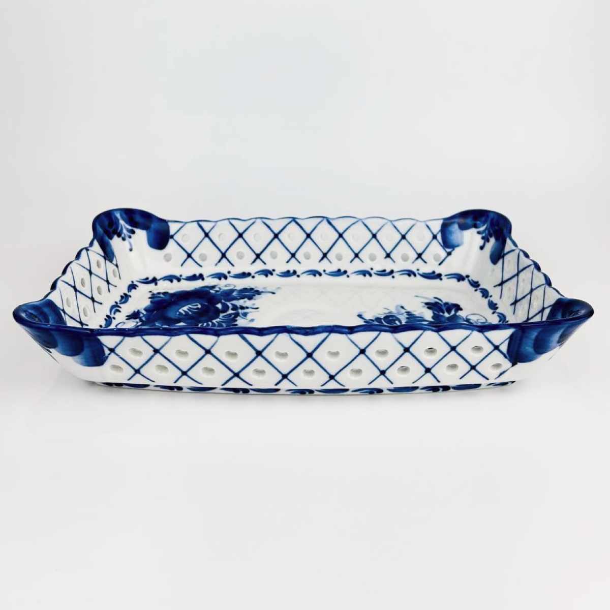 Купить Сухарница прямоугольная, Блюдо глубокое, Хлебница на стол. 27 см. Объединение Гжель. Авторская роспись. Фарфор.