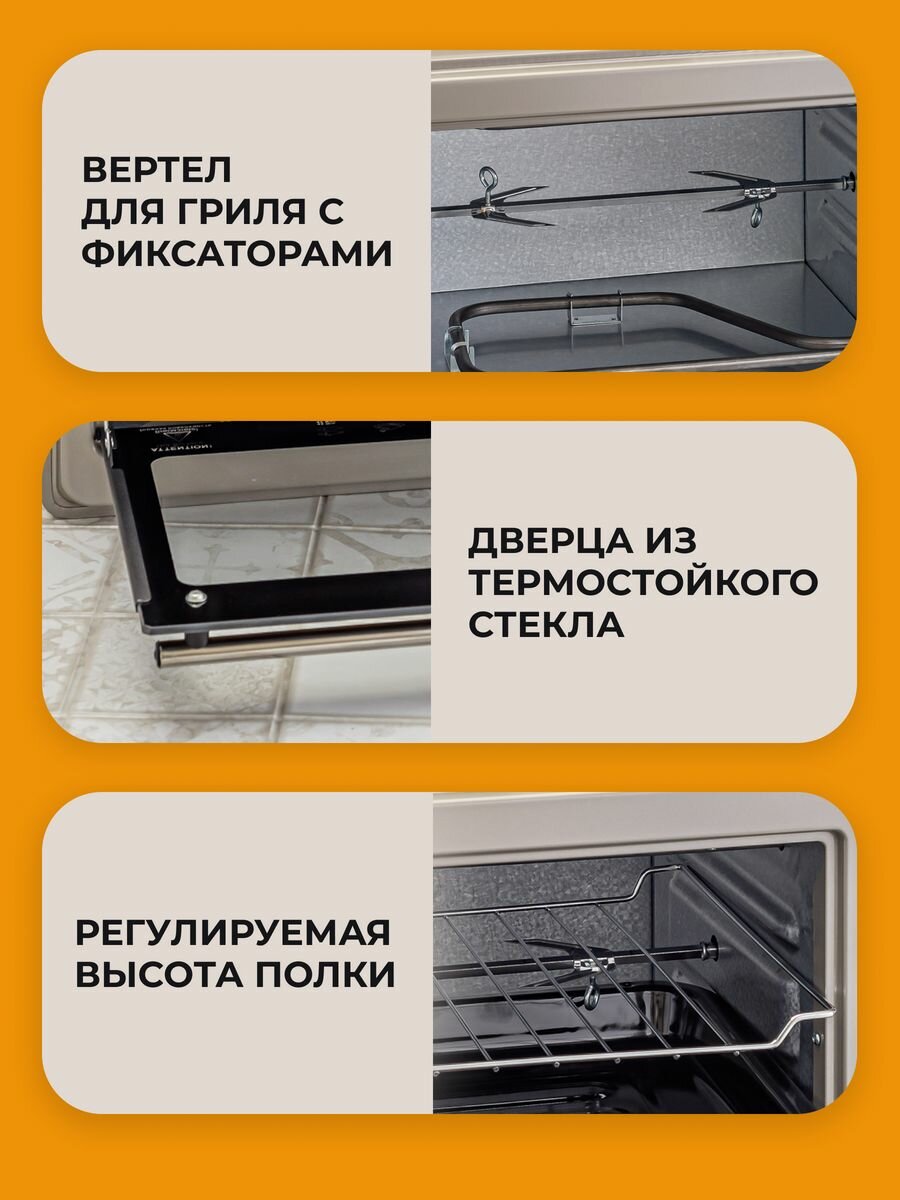 Из всех рассмотренных производителей выбрали эту, т.к. ценовой сегмент приятный. В других моделях этого сегмента нет вертеля для гриля. Отлично поместилась на маленькой кухне, занимает места не больше чем микроволновая печь. Готовить в ней одно удовольствие, кексы готовятся 20-25 минут, пицца от 30 до 45. Тены хорошо нагреваются, за счёт этого все готовится равномерно. Мыть её легко. Не смотря на то что она не очень большая, спокойно в нее помещаются две формы среднего размера. Аккуратный дизайн. А самое главное простая в управлении, даже ребенок 10 лет справился на ура. Рекомендую товар к покупке. За время использования нареканий к ней нет. |