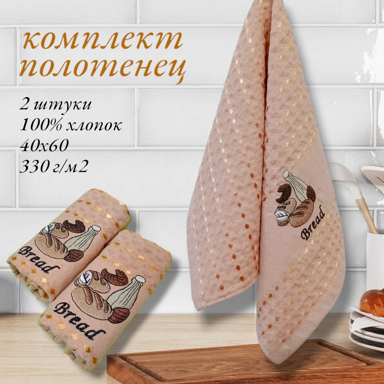 Полотенца кухонные, вафельные 40*60см, 2шт, 330гр/м², бежевые