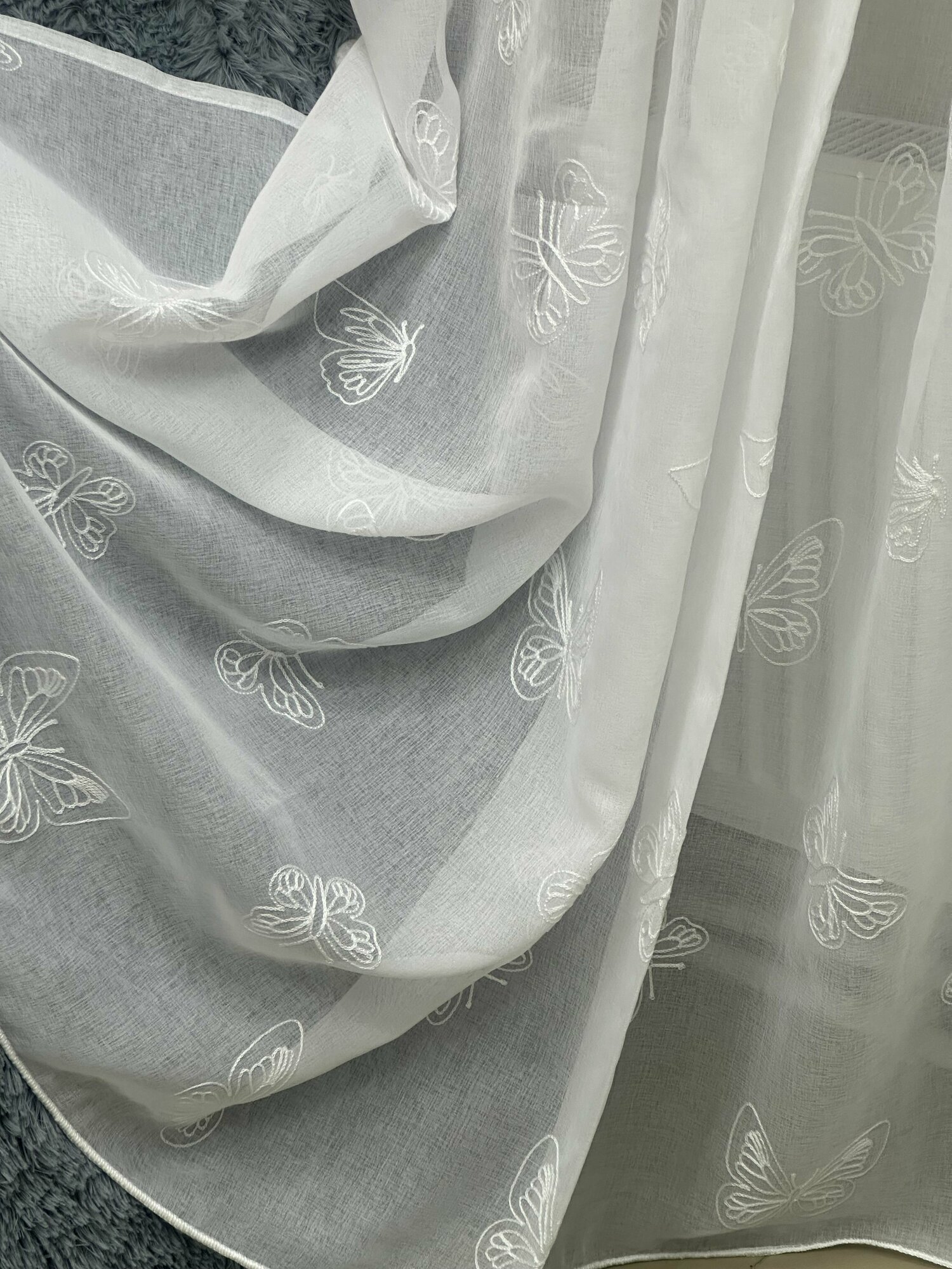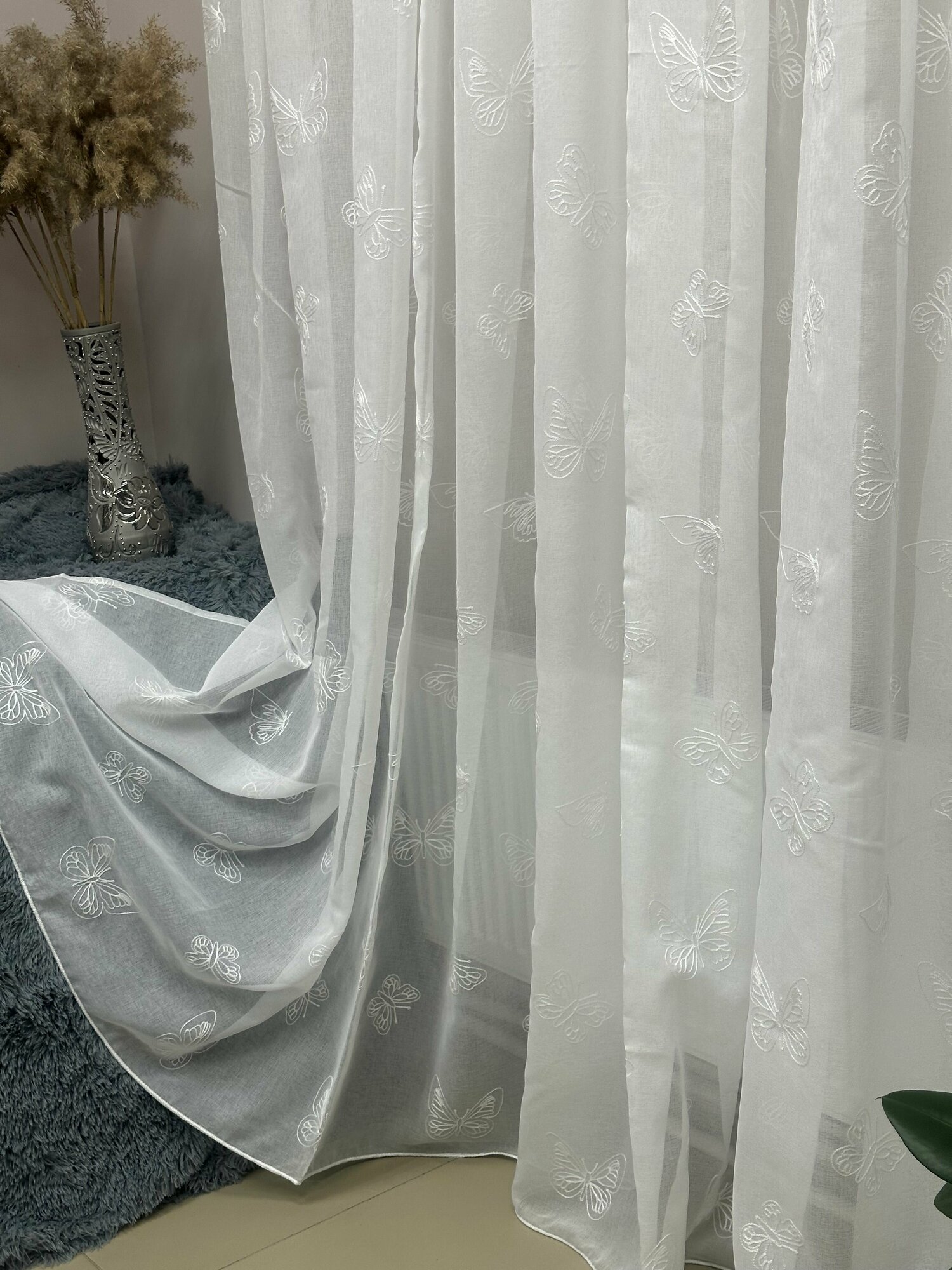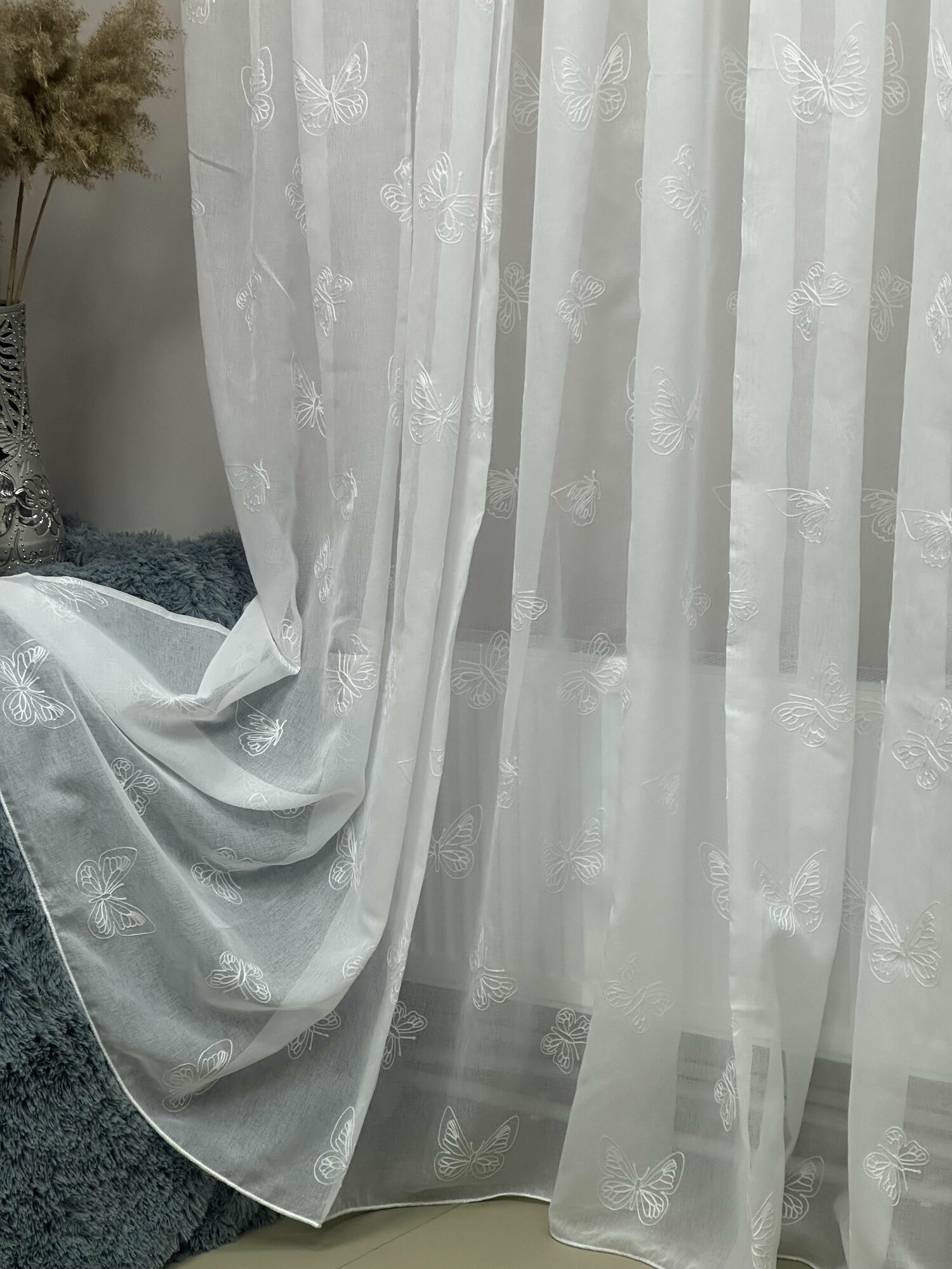 Купить Тюль Батист Лён Вышивка белые Бабочки 600*250