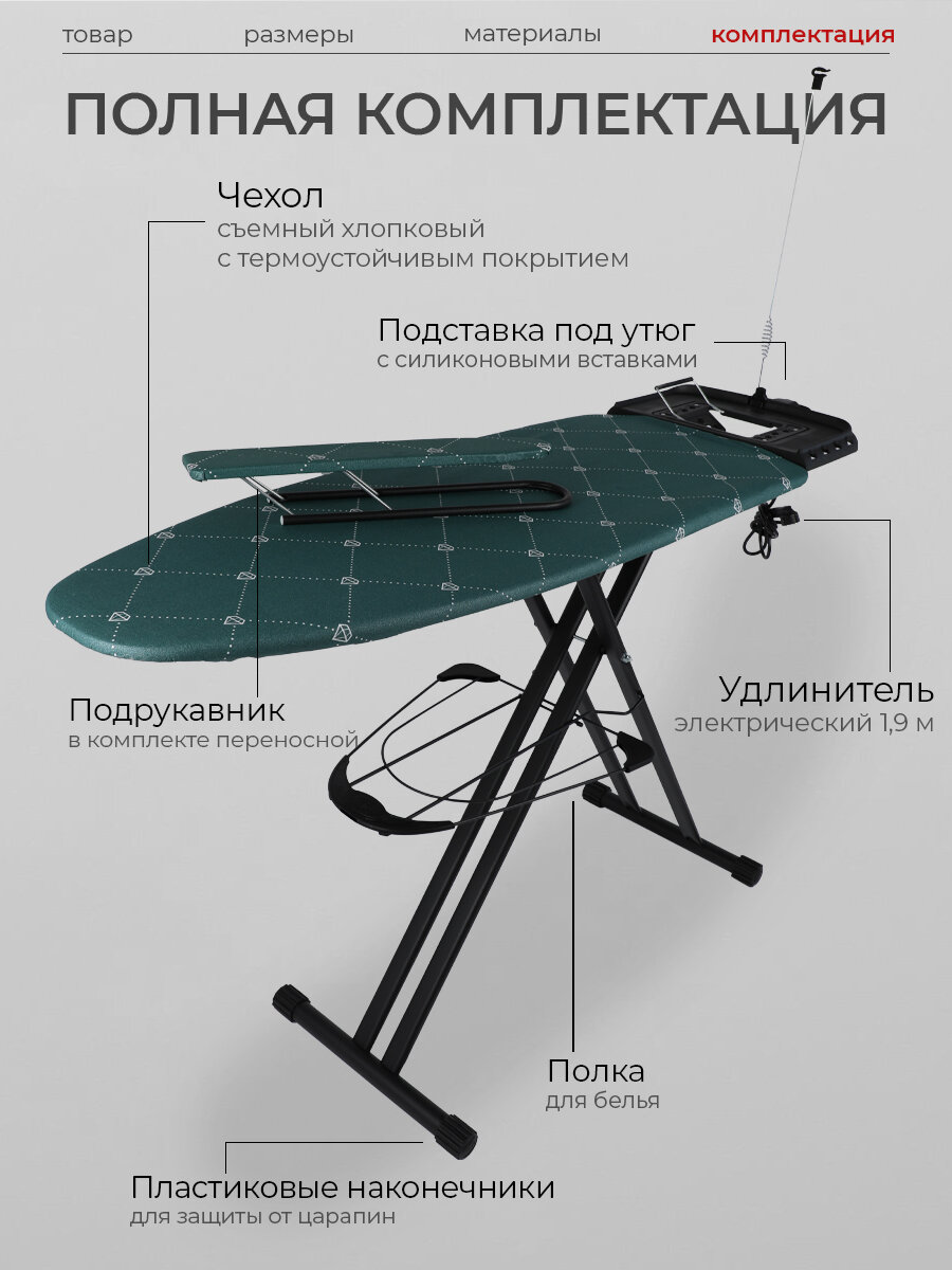 | Комплектация | гладильный рукав / кронштейн для провода / подставка для парогенератора / подставка для утюга / полка для белья / удлинитель |