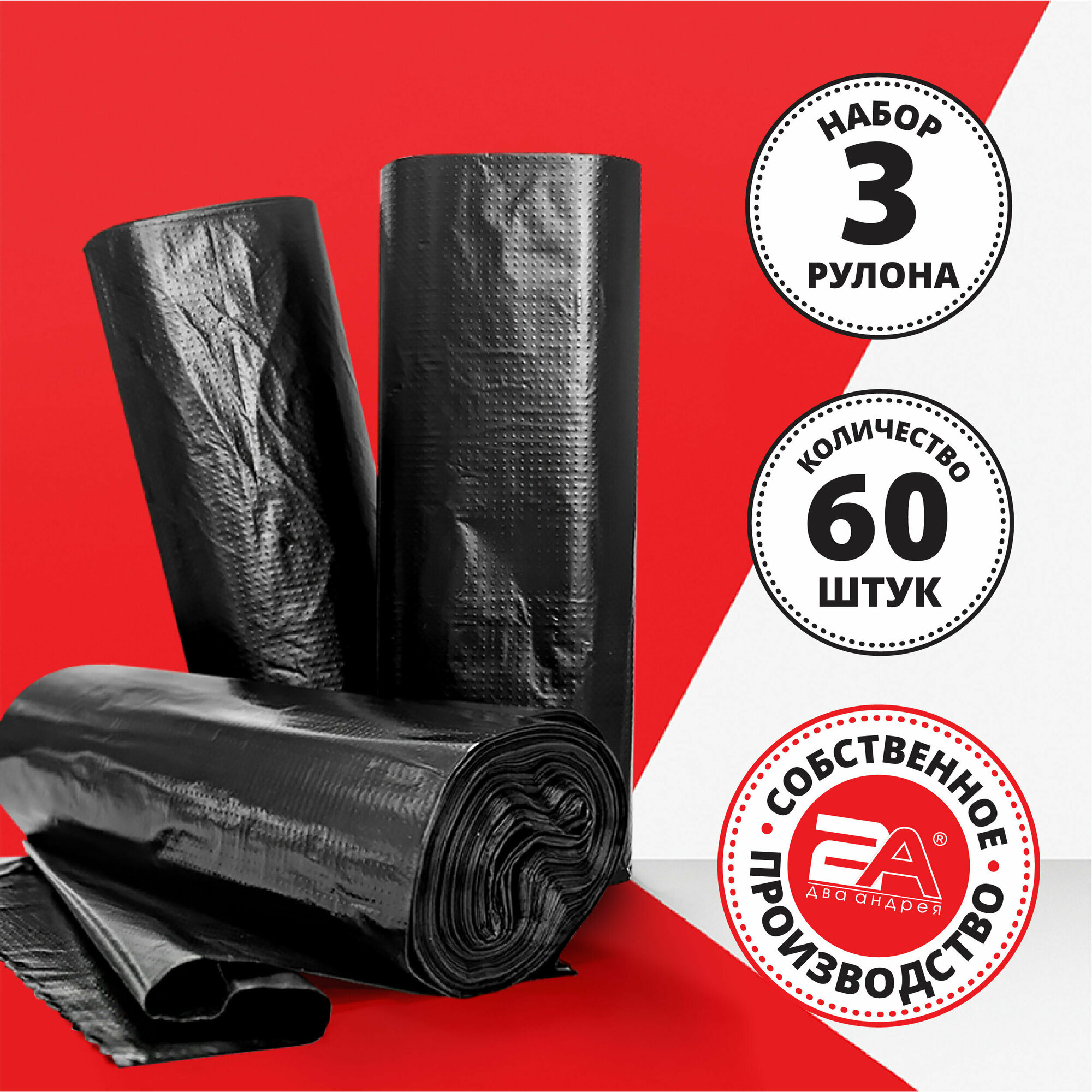 Пакеты для мусора 60 л прочные, мусорные мешки 60 л цветные, 3 рулона, 60 шт.