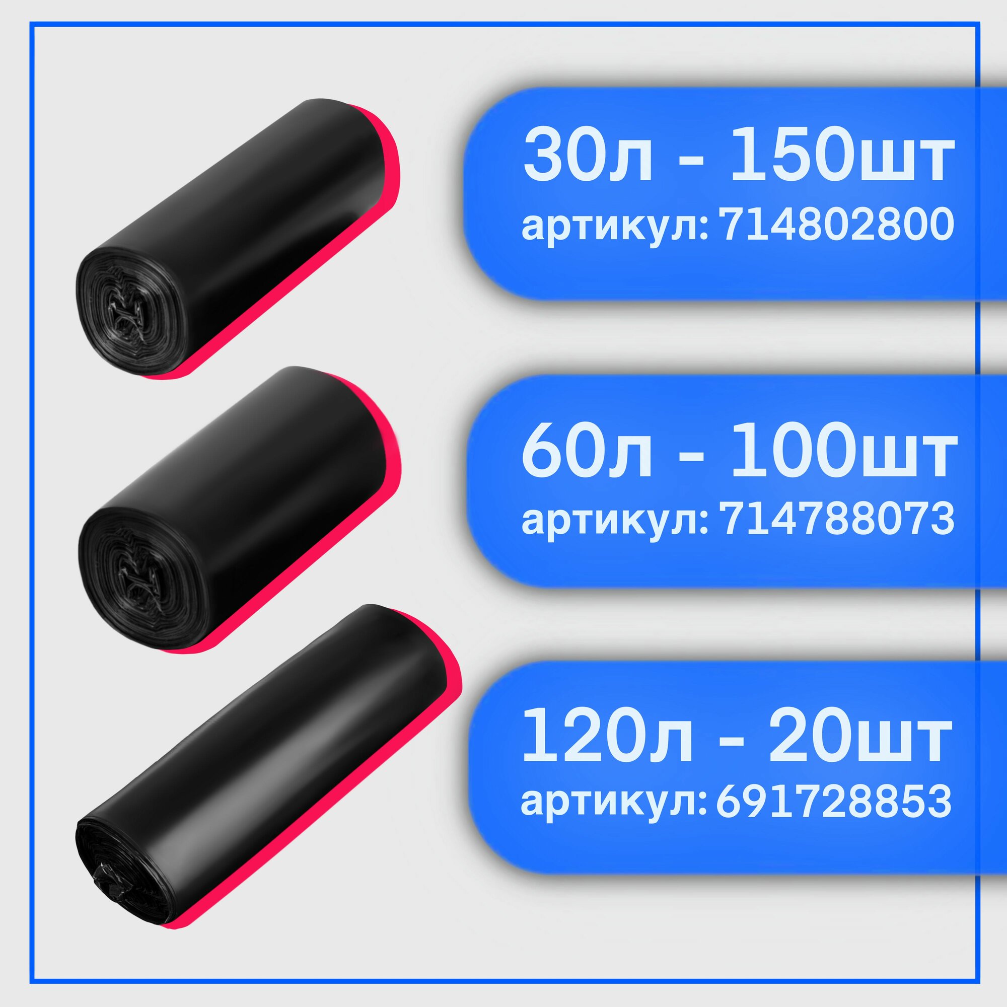 Мешки для мусора 30 л прочные, 150шт, 18мкм, пакеты не просвечивают, плотные