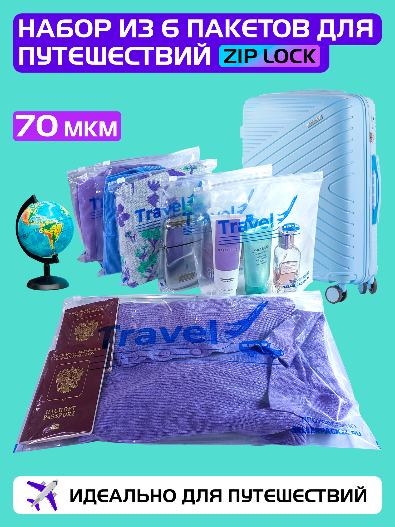 Пакеты слайдеры прозрачные с Zip lock бегунком для путешествий, 70 мкм. Набор 6 штук. интересное:
