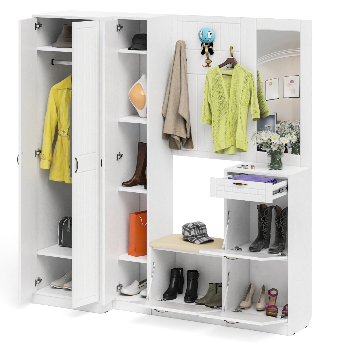 Зеркало для прихожей с обувницей и шкафом П-6, цвет белая шагрень/фасады МДФ белое дерево фрезеровка прованс, ШхГхВ 110х50х210 см.