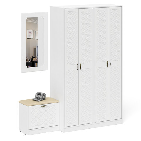 Прихожая Мебельный двор П-6 Тумба для обуви 2 секции + Зеркало, цвет белая шагрень/фасады МДФ белое дерево фрезеровка ромб (1024856)