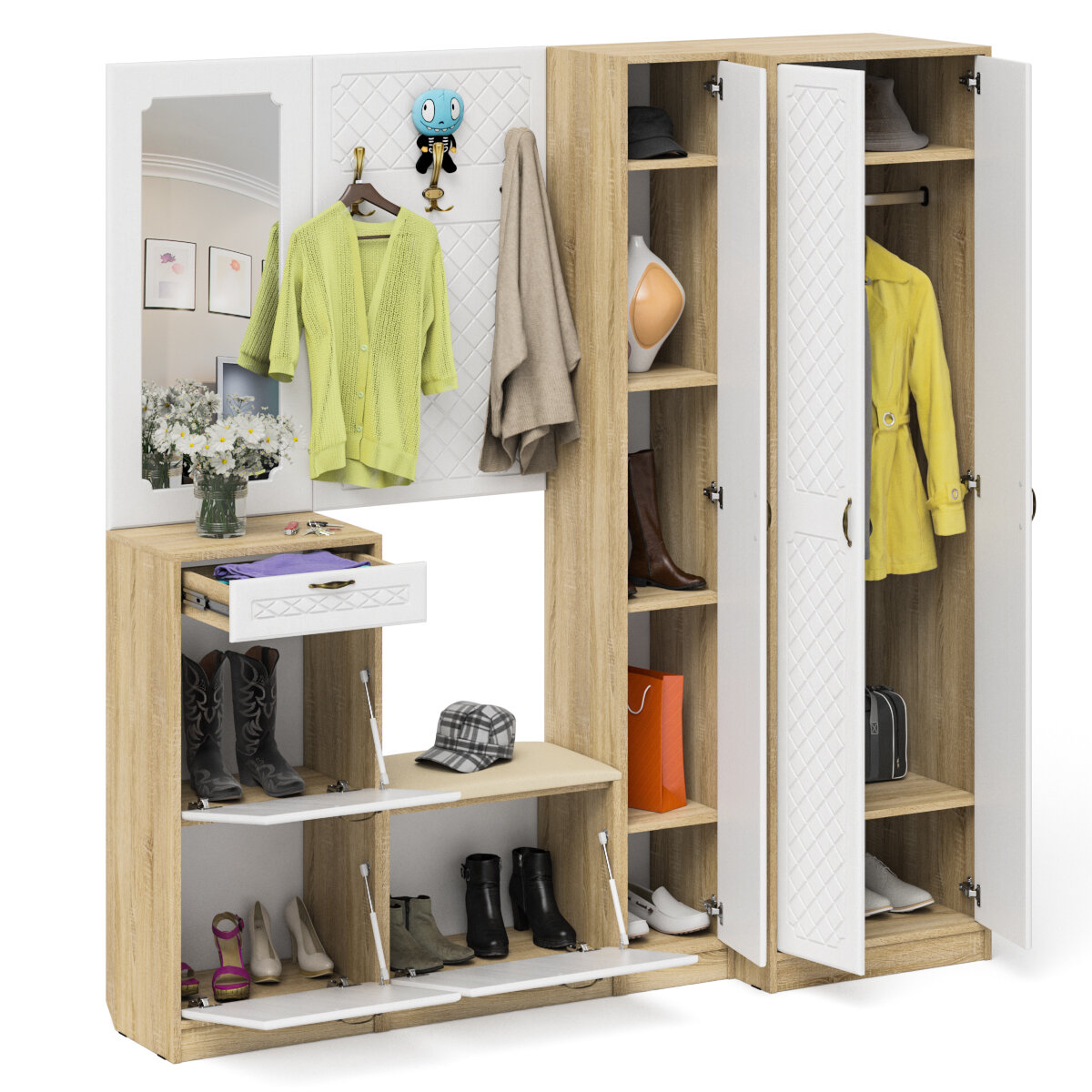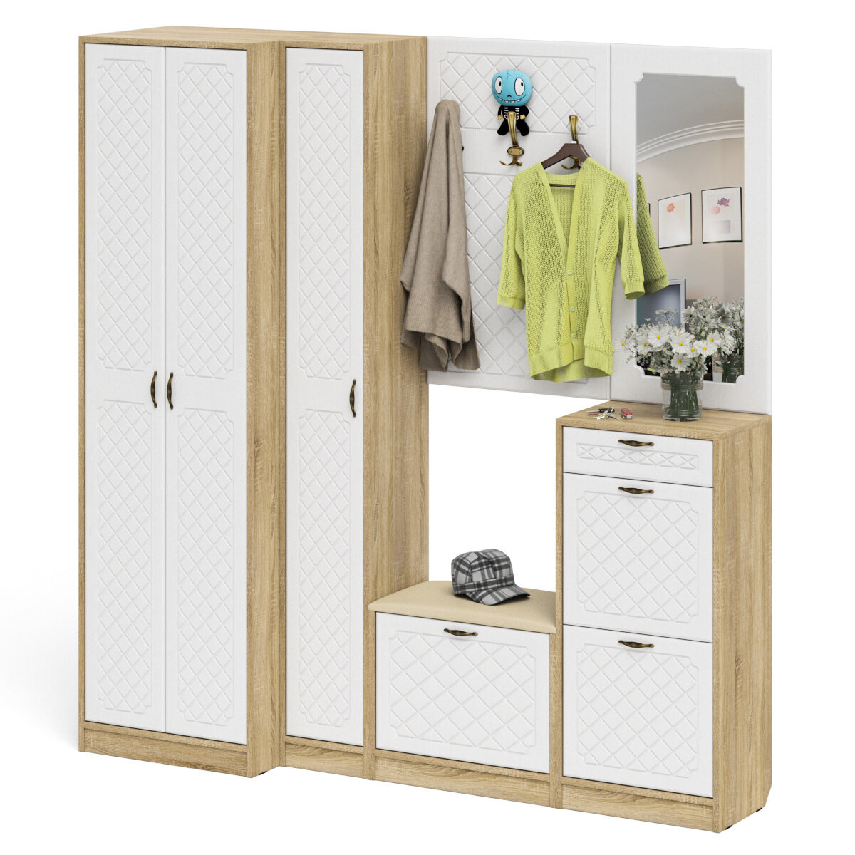 Прихожая П-6 Компоновка № 18, цвет дуб сонома/фасады МДФ белое дерево фрезеровка ромб