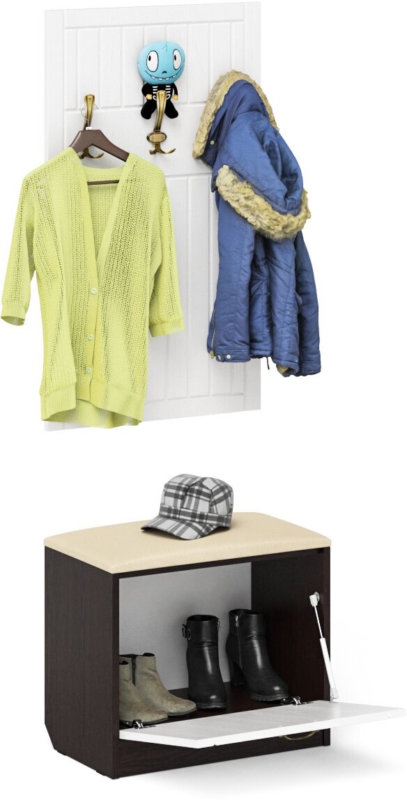 СохранитьОбувница с мягким сиденьем с вешалкой для одежды П-6, цвет венге/фасады МДФ белое дерево фрезеровка прованс, ШхГхВ 60х35х200 см. интересное: