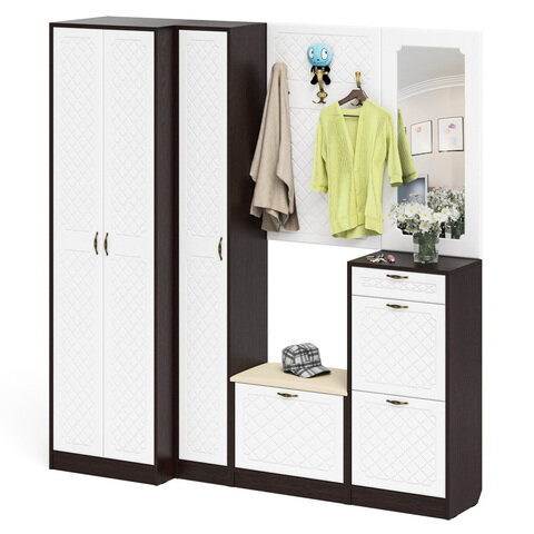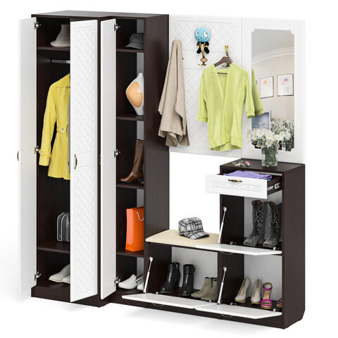 Прихожая П-6 Компоновка № 08, цвет венге/фасады МДФ белое дерево фрезеровка ромб