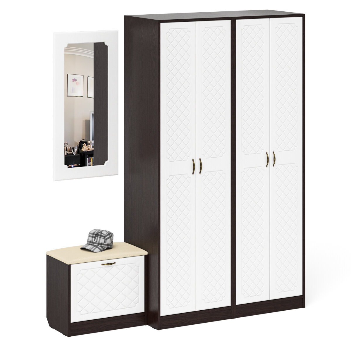Зеркало для прихожей с обувницей и шкафом П-6, цвет венге/фасады МДФ белое дерево фрезеровка ромб, ШхГхВ 110х50х210 см.