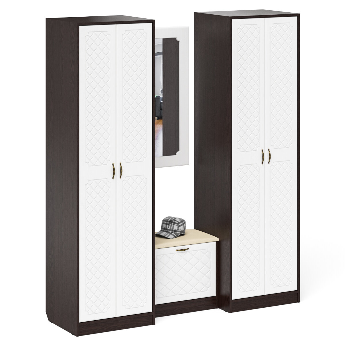Прихожая П-6 Тумба для обуви 2 секции + Зеркало, цвет венге/фасады МДФ белое дерево фрезеровка ромб