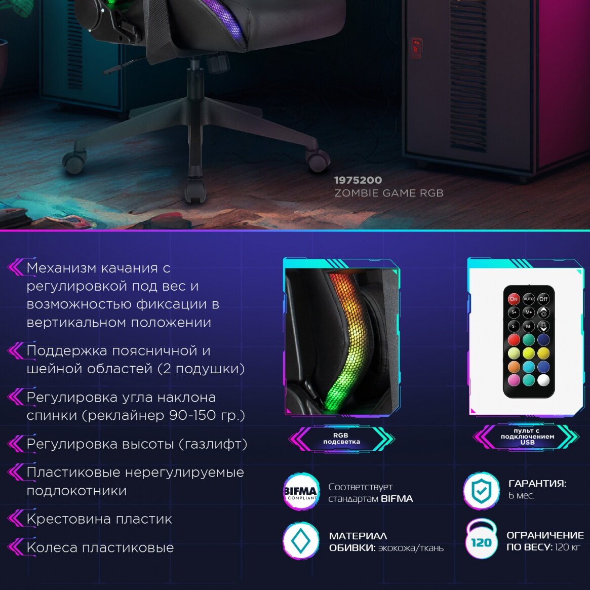 Игровое кресло Zombie Game RGB, экокожа/ткань, крестовина пластиковая интересное:
