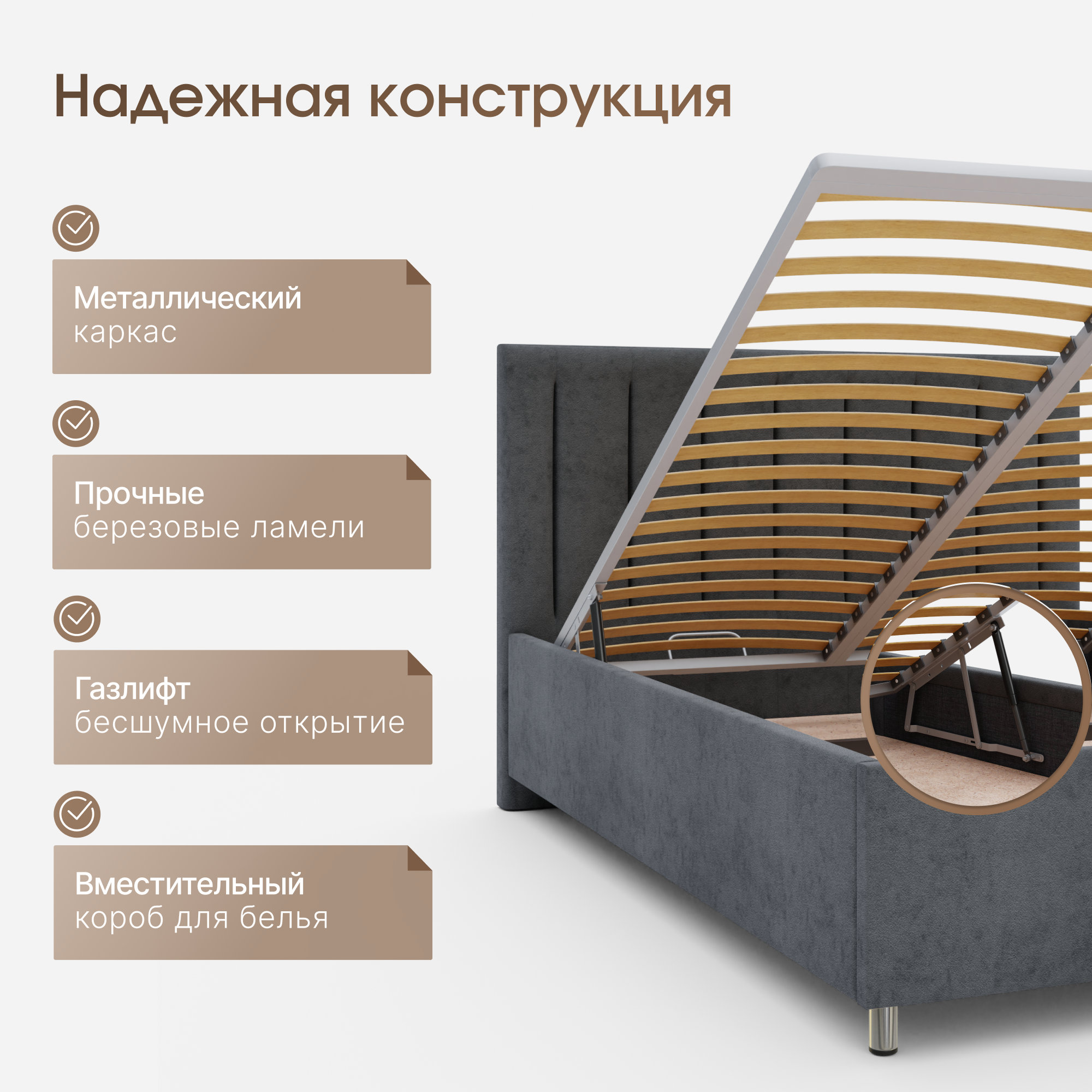 | Особенности | мягкое изголовье, основание под матрас, с изножьем, с подъемным механизмом, с ящиком для белья, усиленная конструкция |