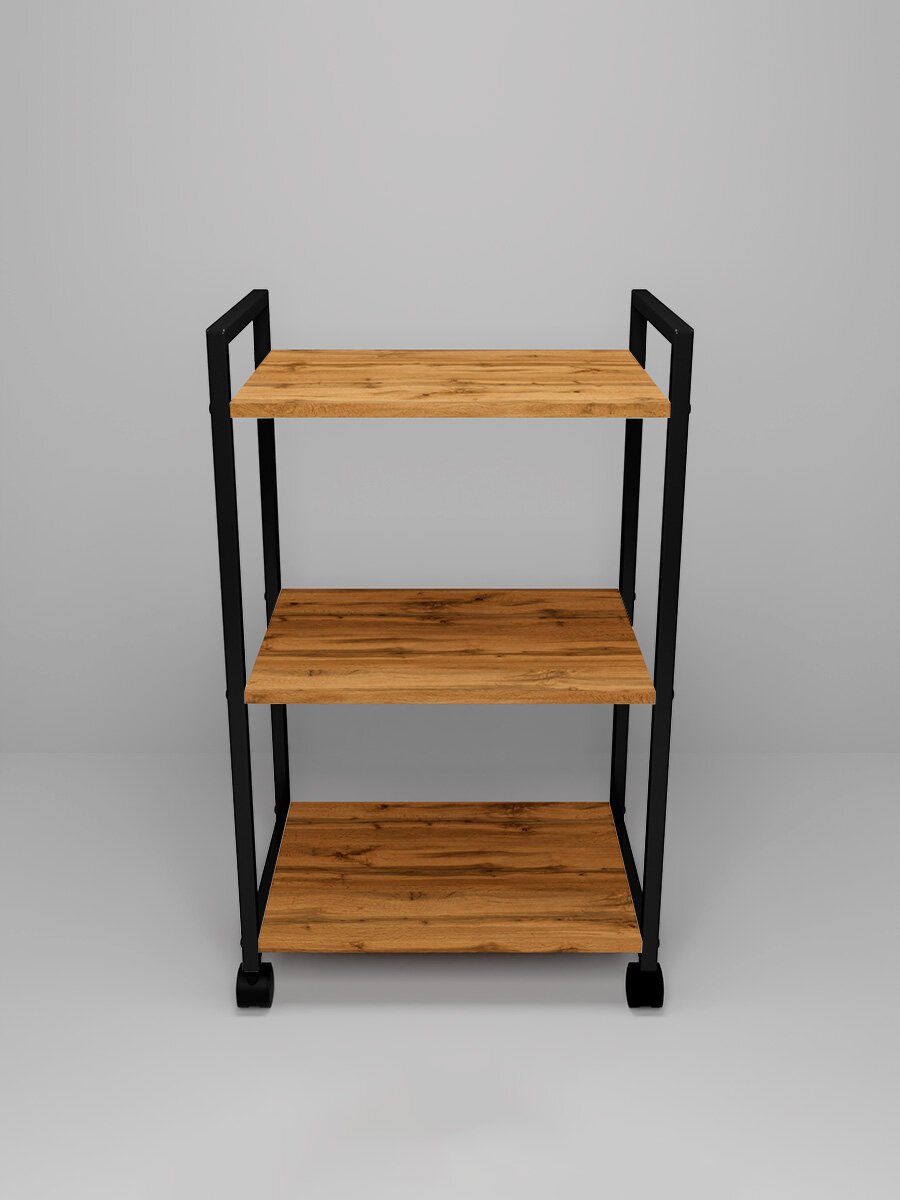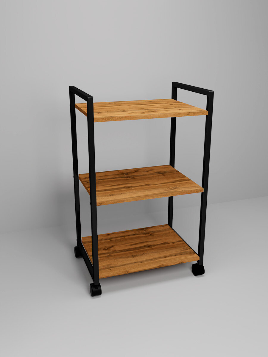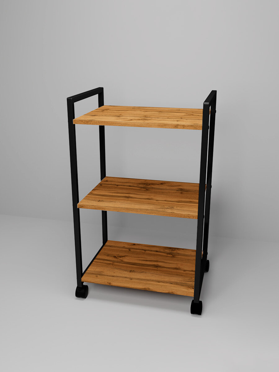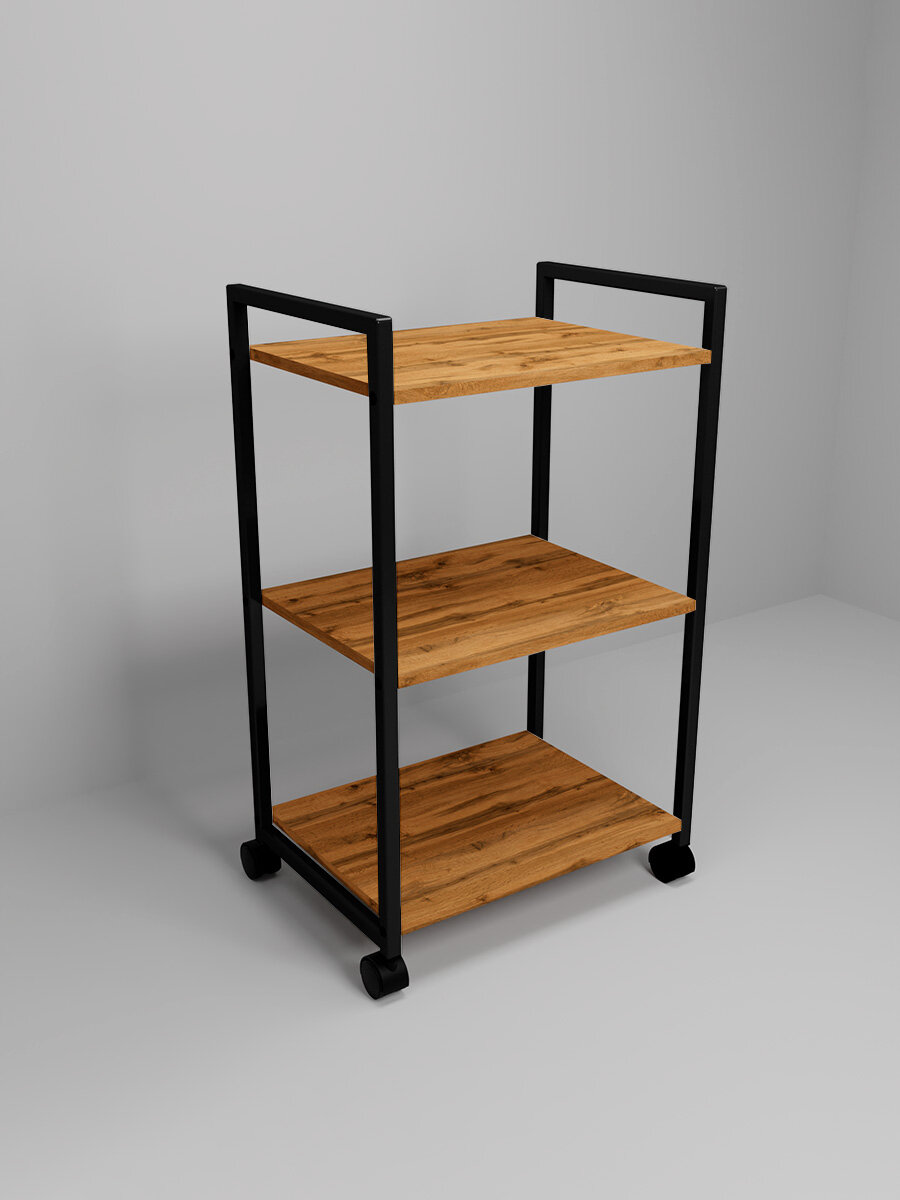 Купить Металлическая этажерка Лофт на колесиках, Уютный мастер, черный металл, дуб вотан
