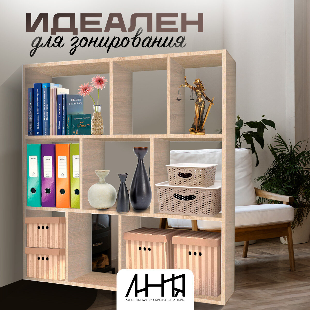 Стеллаж деревянный напольный, сонома, 110х110х24 см, 9 полок, "Инно", мебельная фабрика "Линия" интересное: