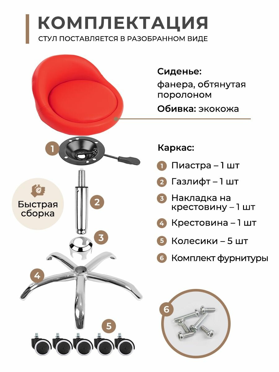 Стул мастера GL-BR-004 мягкий, набор 5 шт, на колесиках, с низкой спинкой, цвет красный