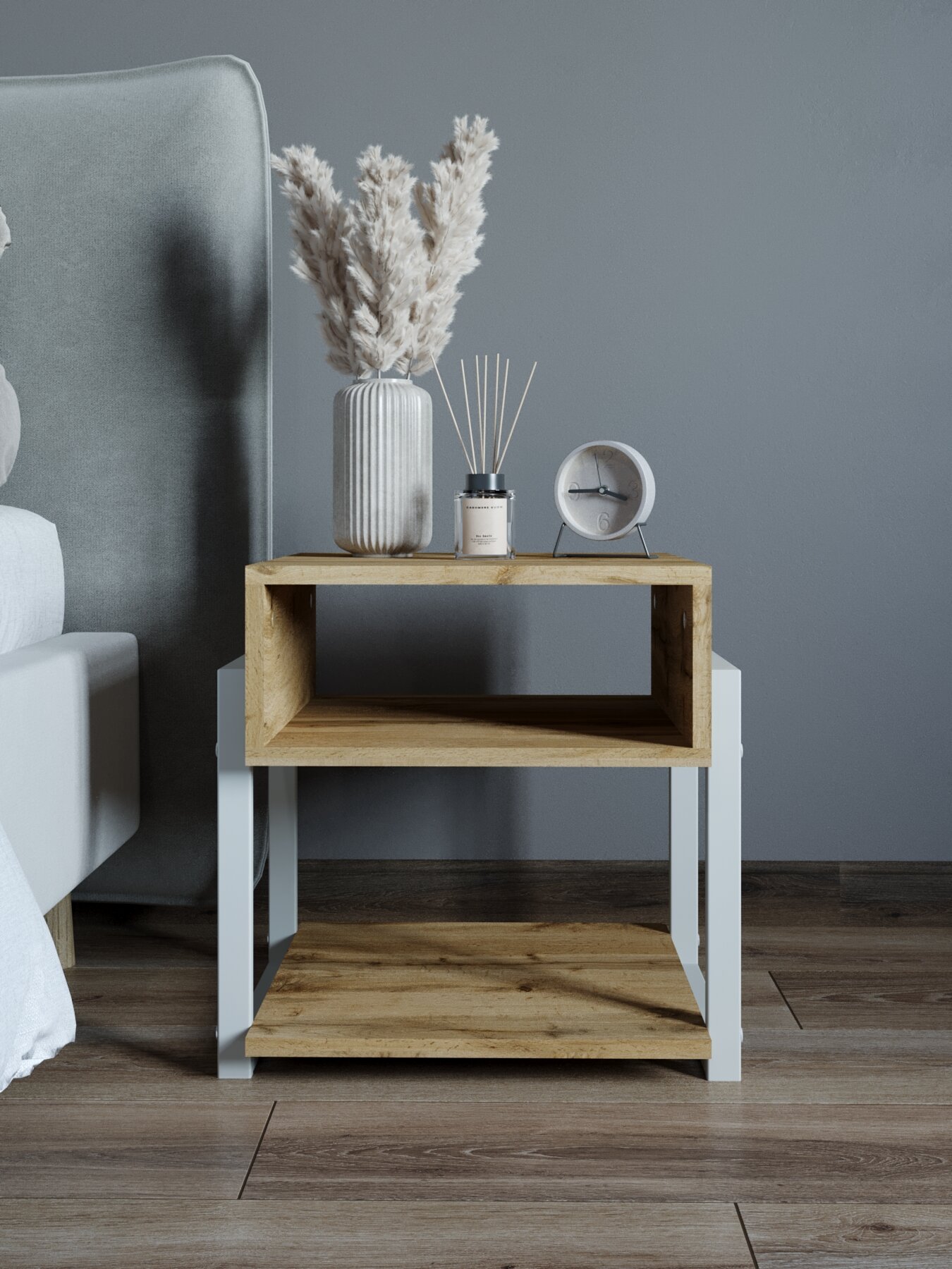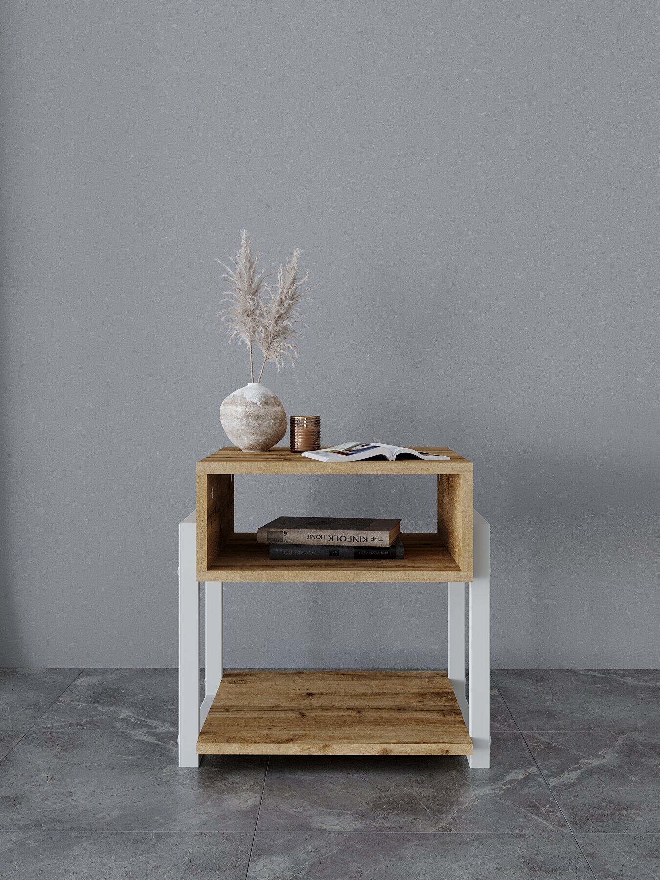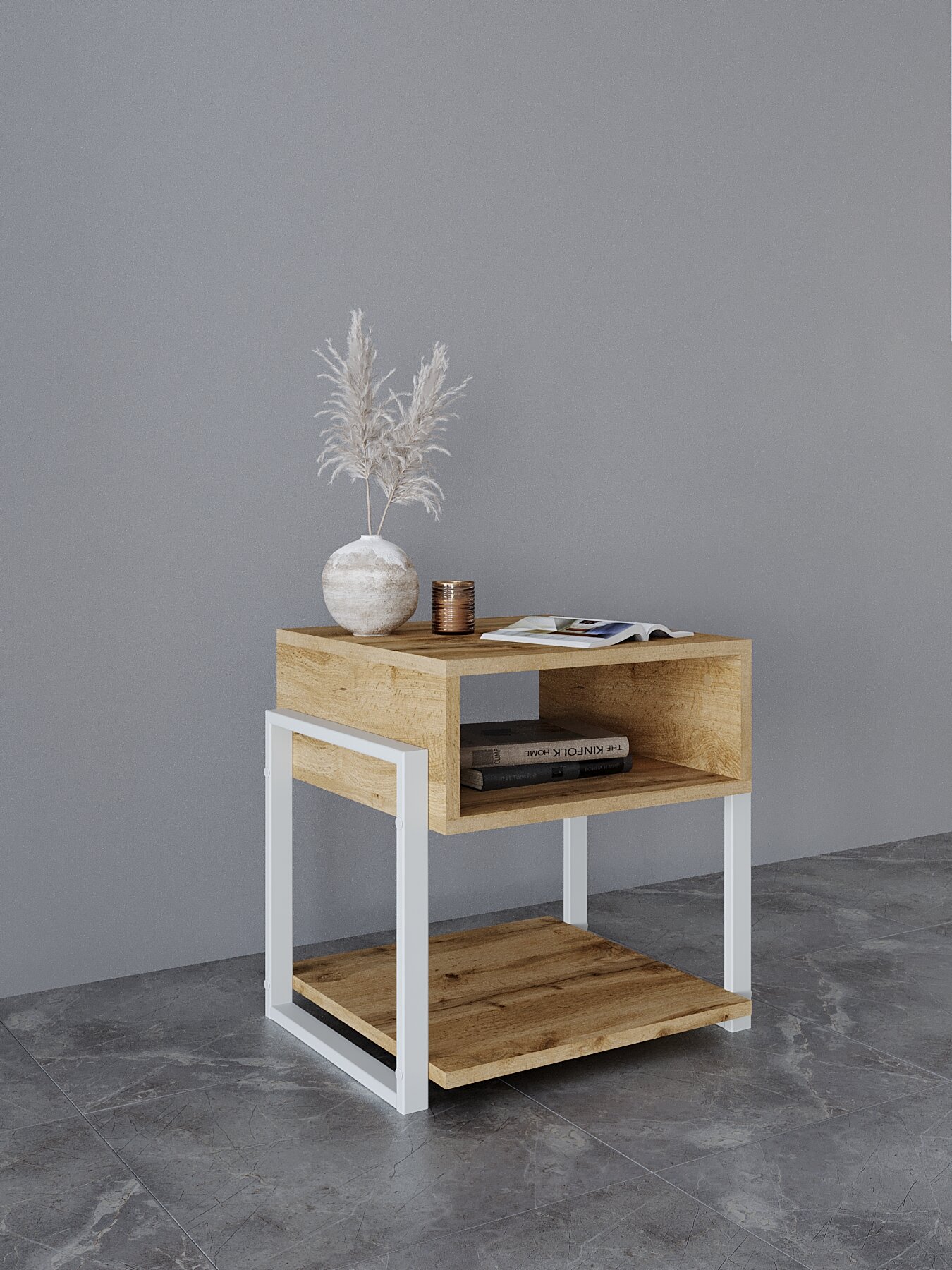 Тумба прикроватная для спальни, гостиной лофт KM LOFT белый/дуб вотан