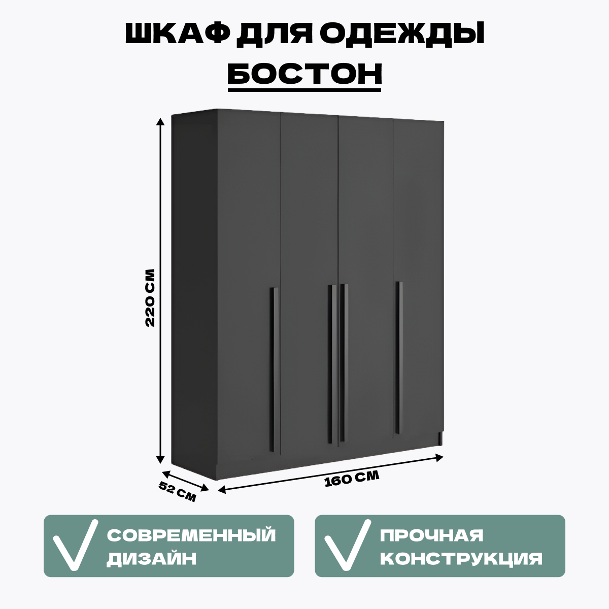 Шкаф для одежды Boston серый, 220х160х52, ЛДСП Серый графит, 4 дверцы, 9 полок, HomeGrad интересное: