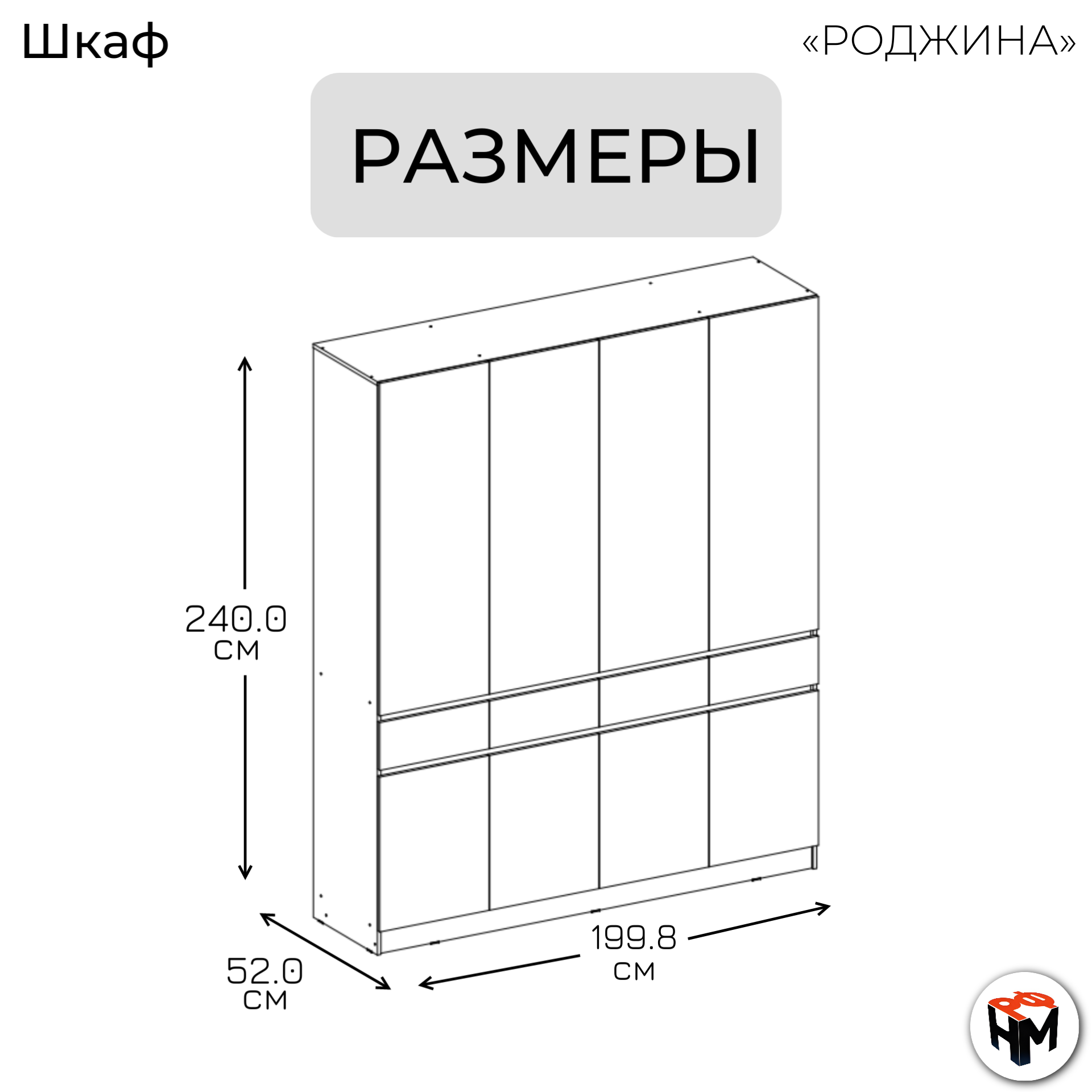 | Комплектация | Шкаф распашной имеет 8 дверей, 4 выдвижных ящика на шариковых направляющих, штангу для вешалок |