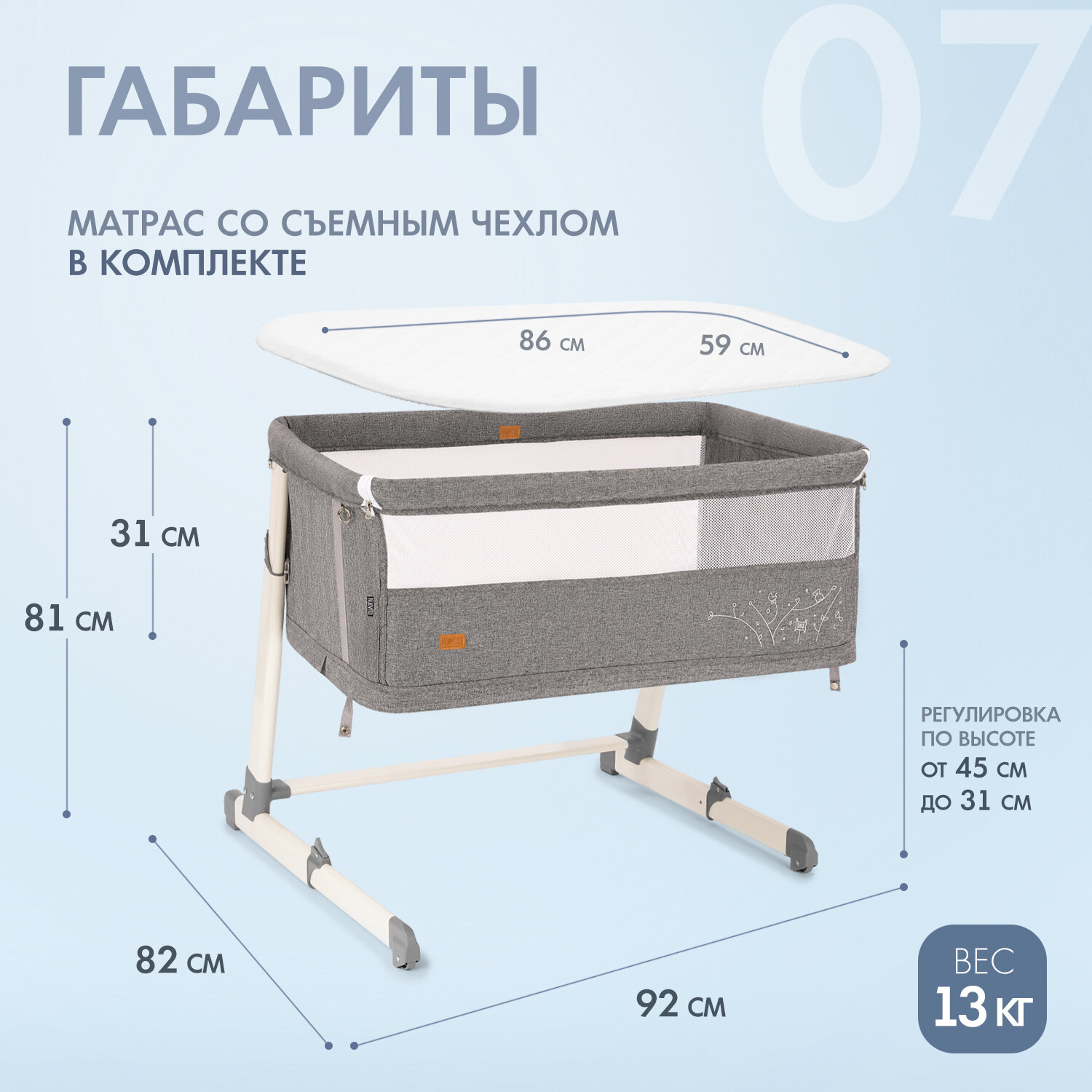 | Комплектация | Противоскользящие накладки на ножки / ремень для фиксации с родительской кроватью / матрас со съемным чехлом / съемная боковая стенка |