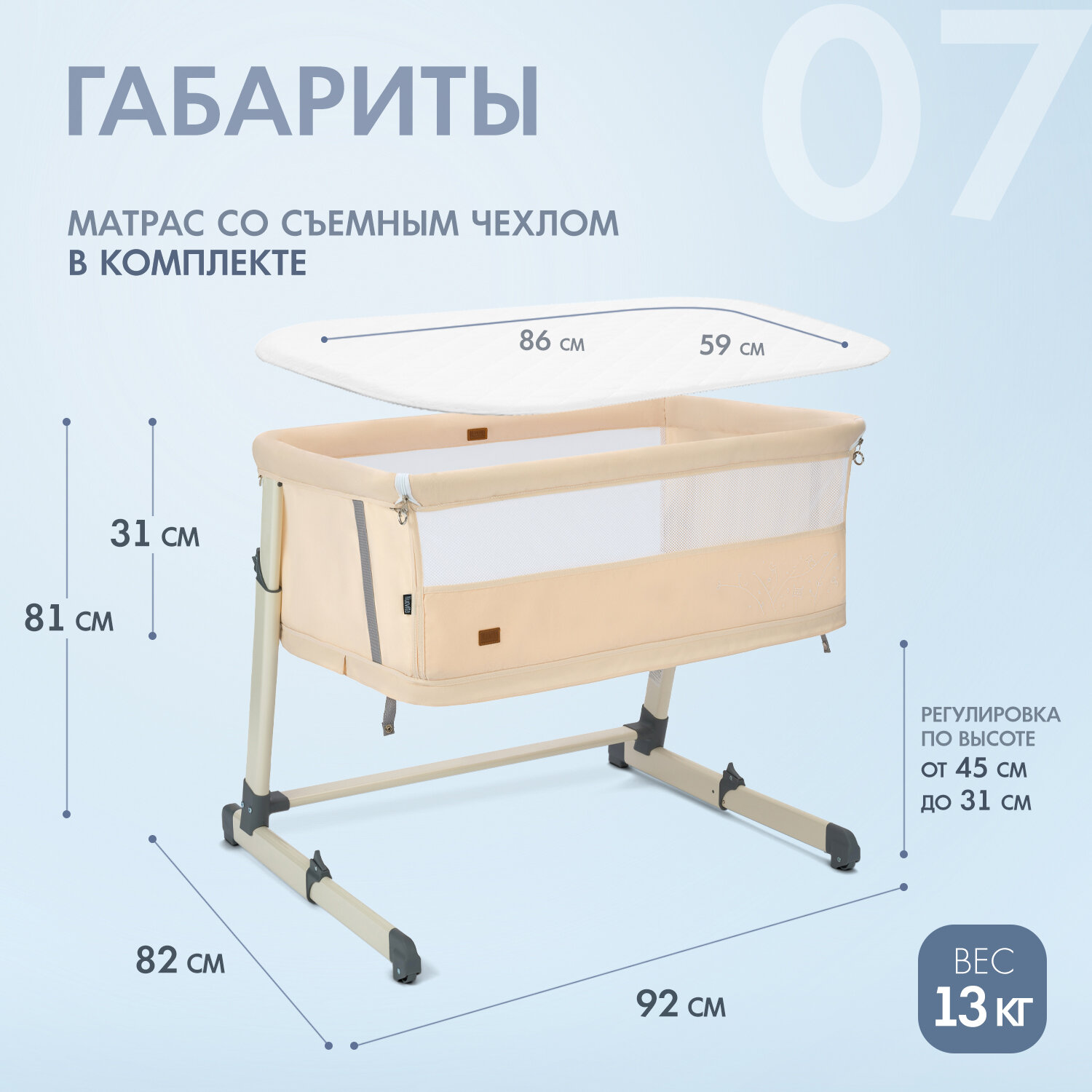 | Комплектация | Противоскользящие накладки на ножки / ремень для фиксации с родительской кроватью / матрас со съемным чехлом / съемная боковая стенка |