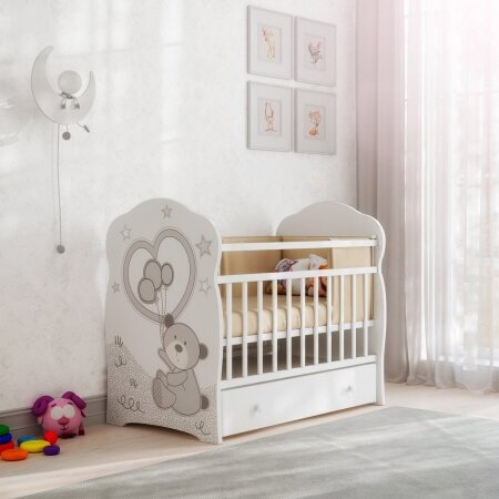 Кроватка детская для новорожденных ВДК Toby с маятником и ящиком, ЛДСП, массив березы, белый