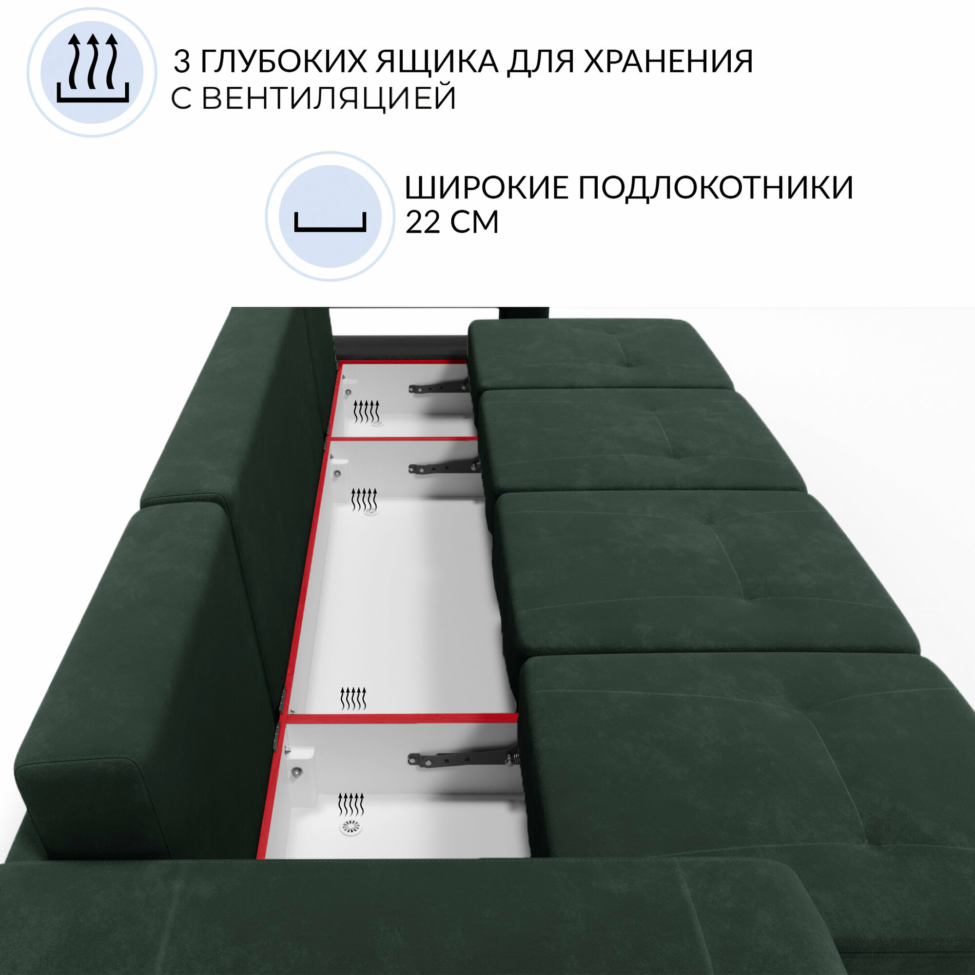 Купить Прямой диван в гостиную «Барон 2 с дополнительной секцией», раскладной диван трансформер на механизме «тик-так», 317х151х90см, зелёный