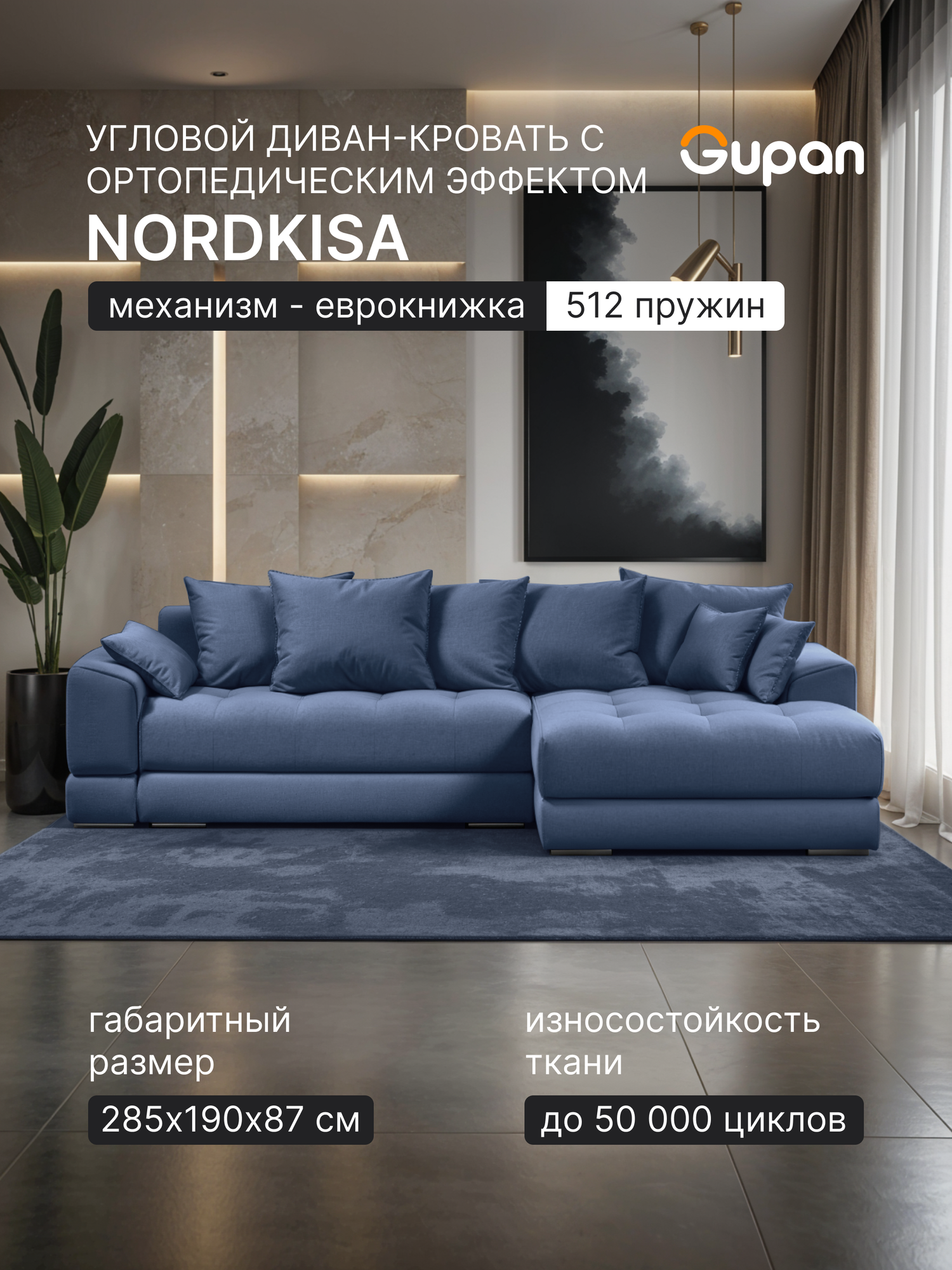 Угловой диван-кровать Gupan Nordkisa, пружины, механизм Еврокнижка, 285х190х87 см, наполнитель ППУ, ящик для белья, цвет Amigo Blue