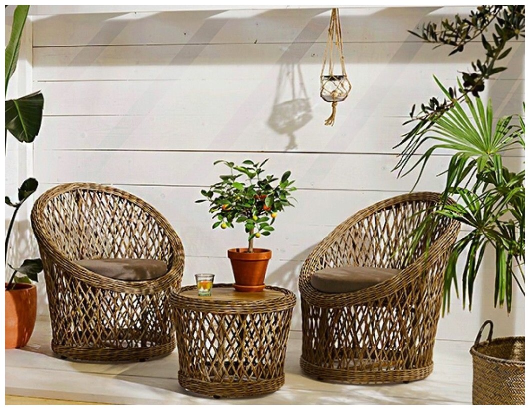 | Комплектация | 2 плетеных кресла, столик, мягкие сидения |
