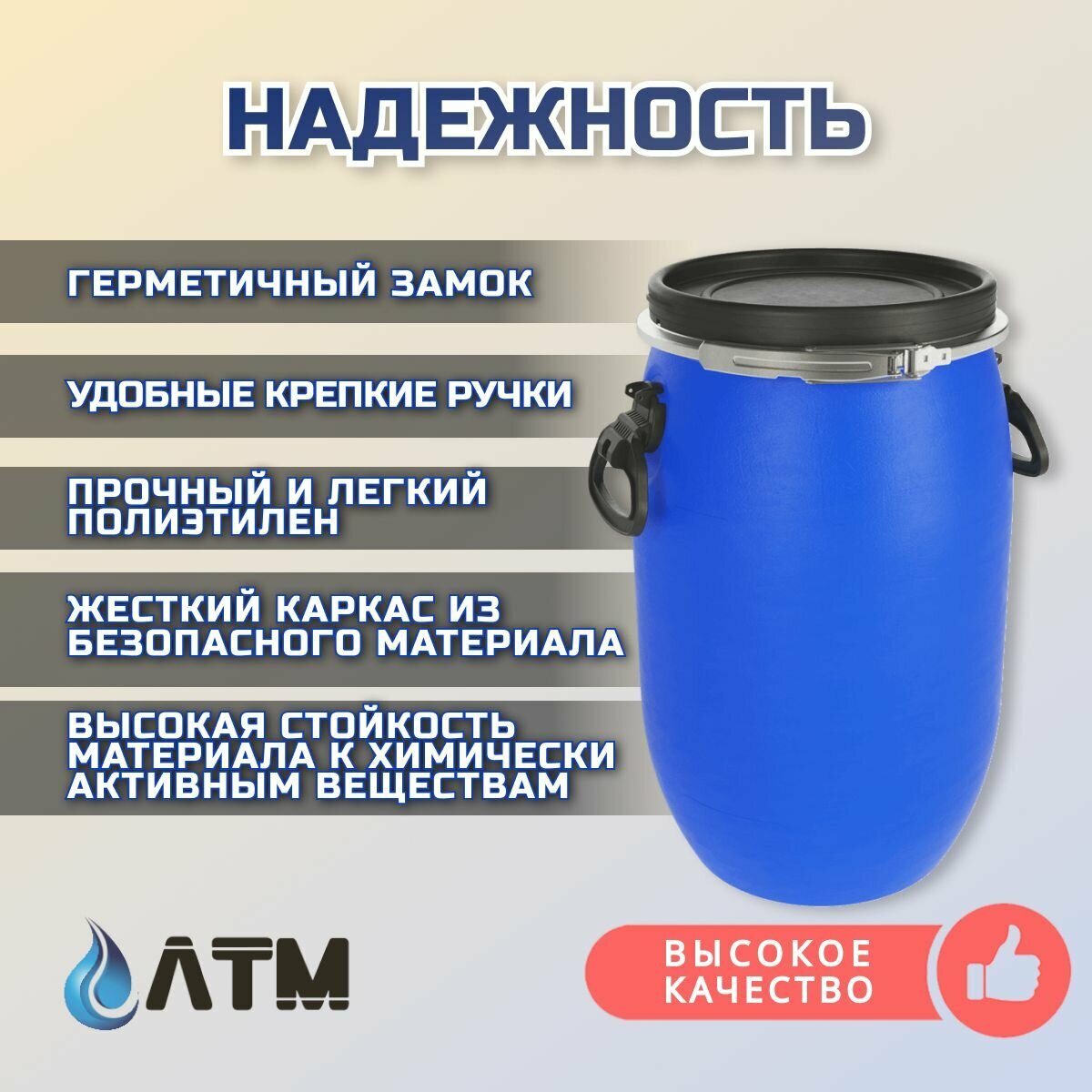 | Комплектация | Бочка - 48л; Крышка; Металлический хомут; Ручки навесные усиленные; Стрелка; Шплинт для пломбирования |