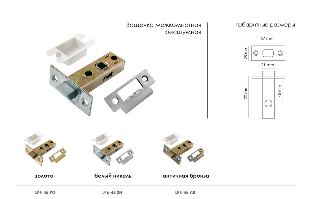 LP6-45 PG, защелка межкомнатная, с пластиковым язычком, цвет - золото