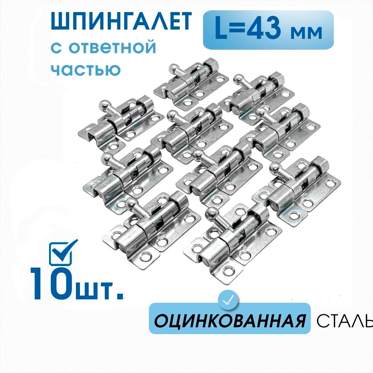 Купить Шпингалет маленький L-43 с ответной частью (10 шт), оцинк. сталь, задвижка малая на дверь накладная ЗТ, щеколда для двери маленькая