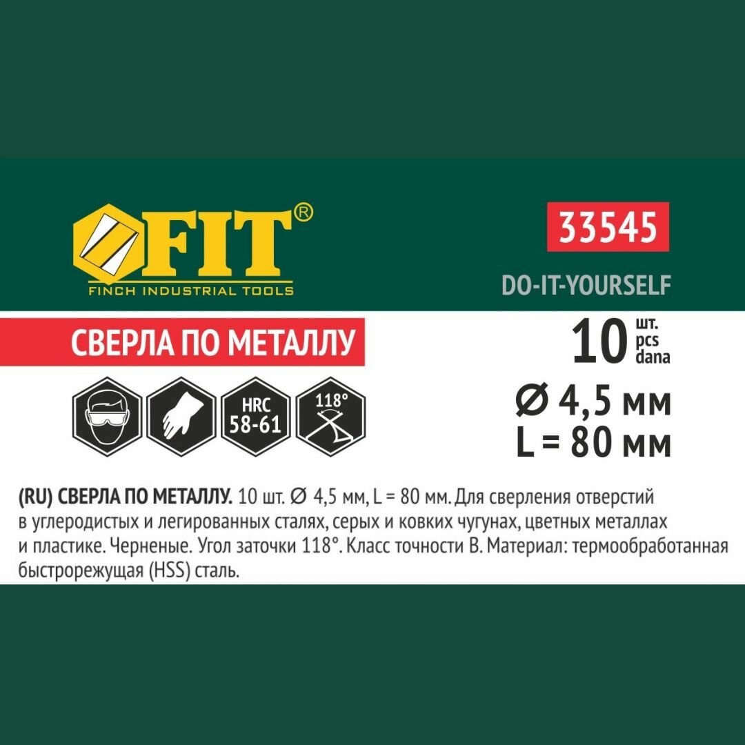 Купить Сверло 10 шт по металлу (4.5x52х80 мм, HSS) FIT черненые