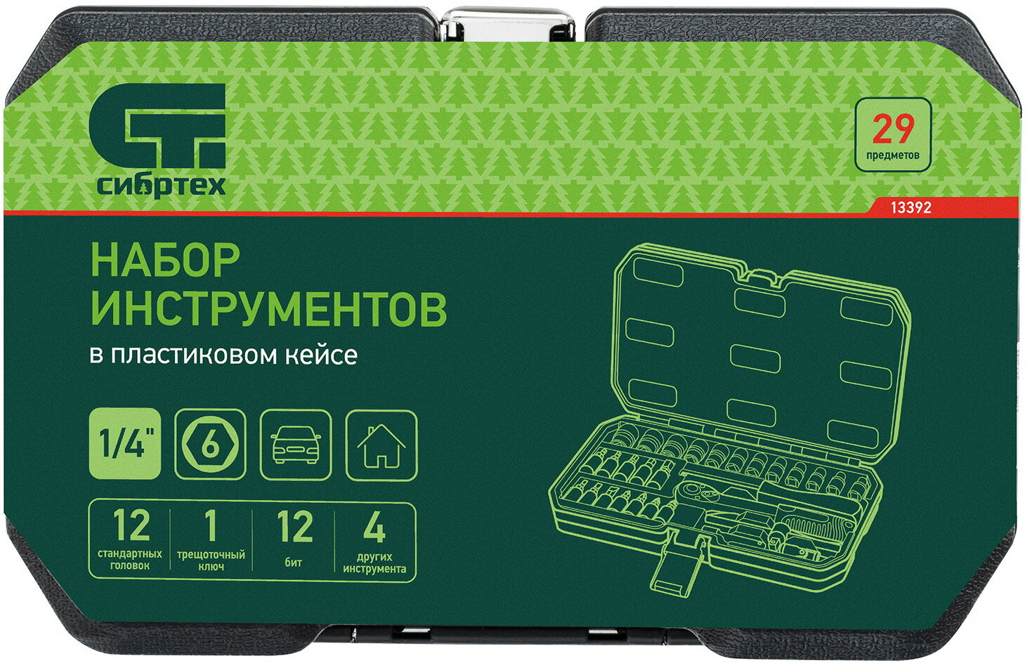 Набор инструментов, 1/4", пластиковый кейс, 29 предметов// Сибртех 13392 .