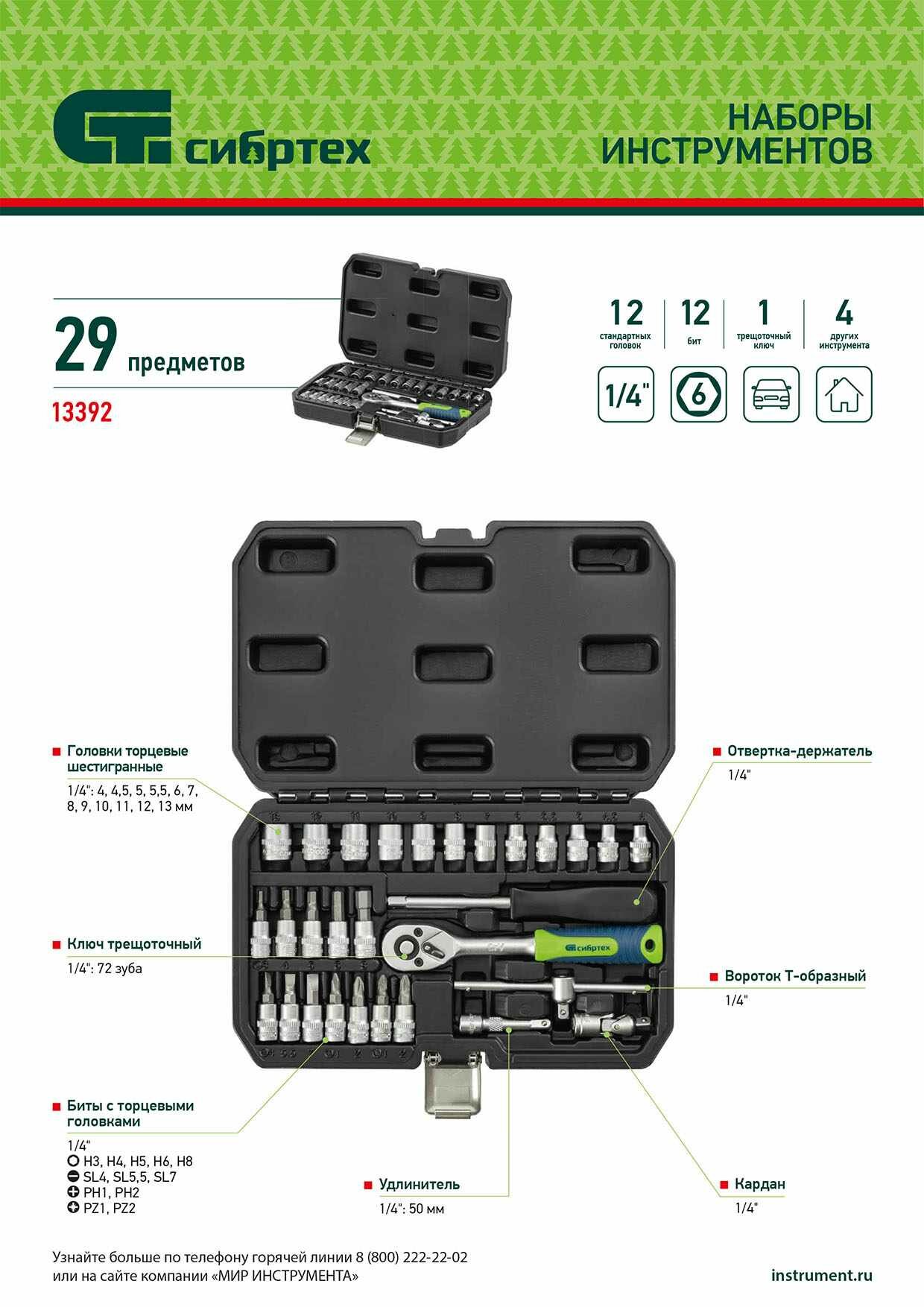 Набор инструментов, 1/4", пластиковый кейс, 29 предметов// Сибртех интересное: