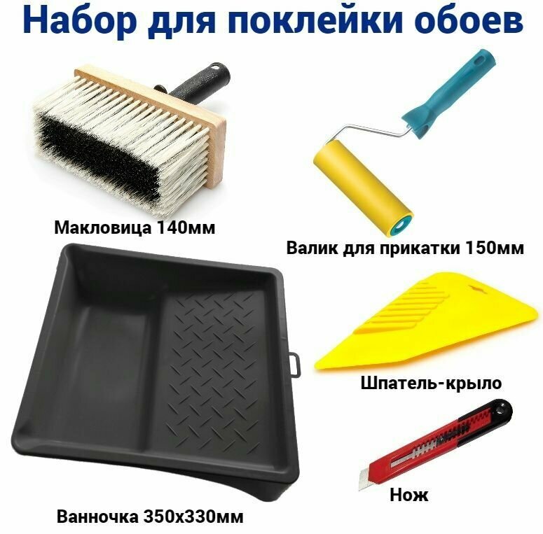 СохранитьНабор малярный для поклейки обоев: валик прижимной 150мм, макловица 140мм, ванночка 330х350мм, шпатель для прикатки обоев, нож. интересное: