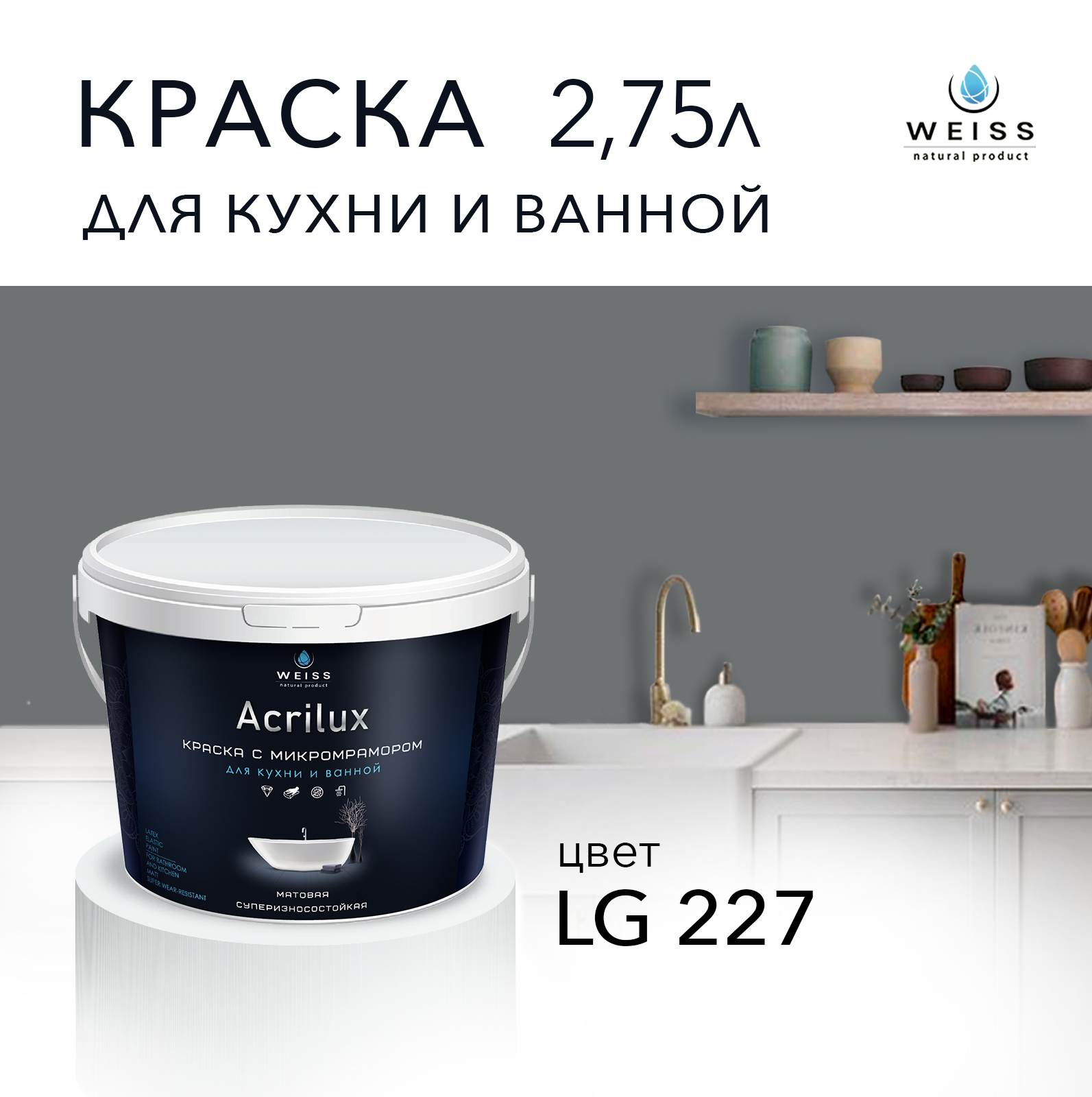 СохранитьКраска латексная WEISS Acrilux для кухни и ванной комнаты влагостойкая моющаяся матовая темно-серый 2.75л lg 227 интересное: