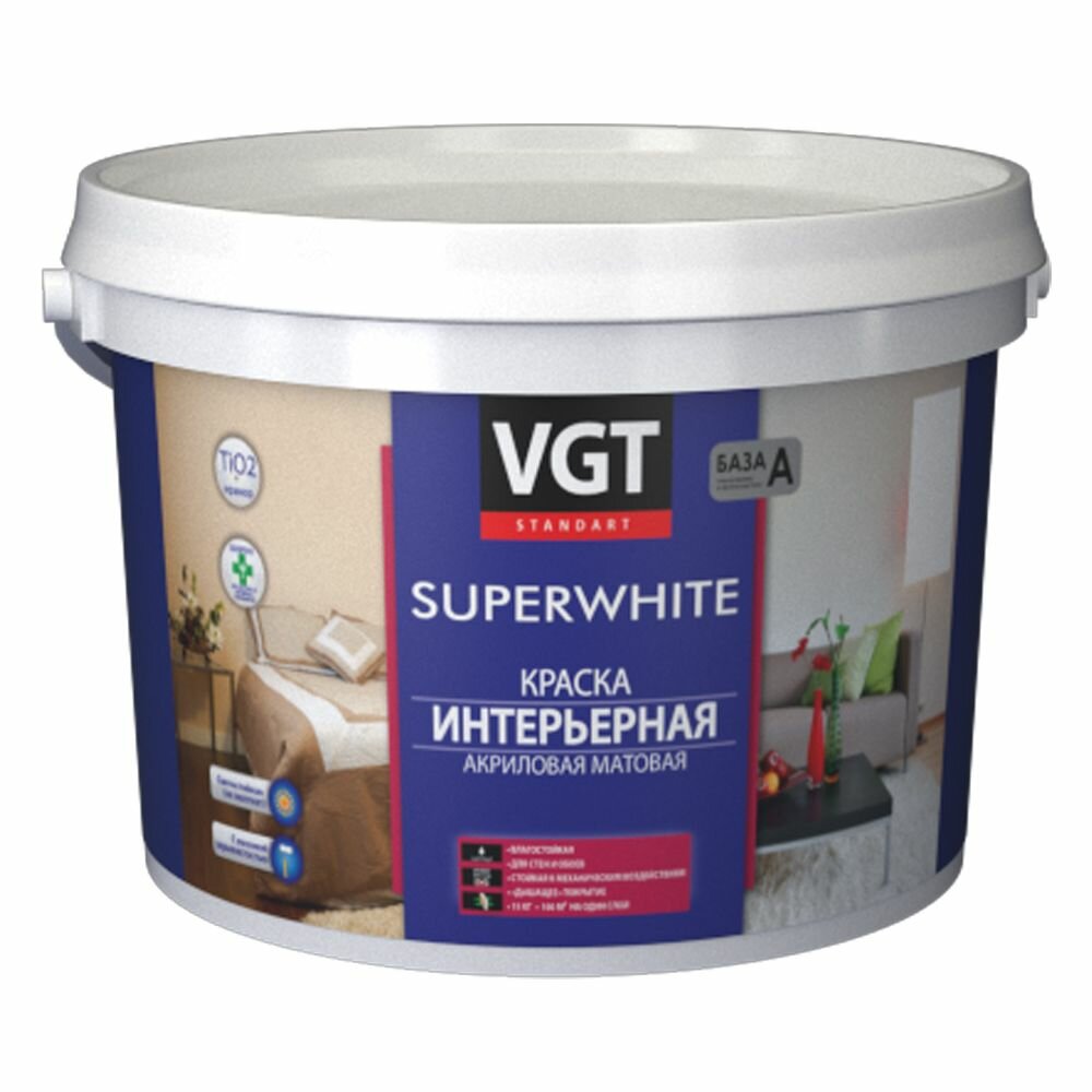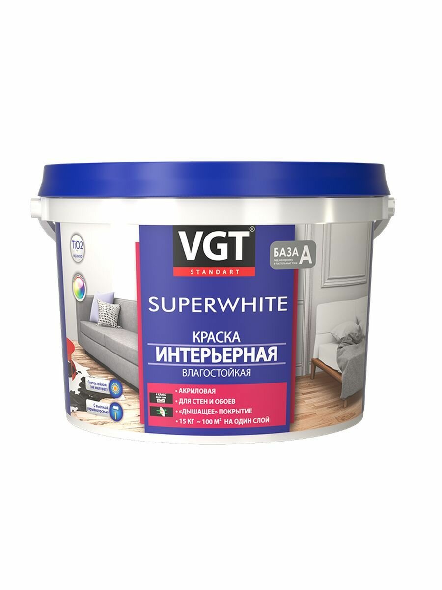 Краска акриловая интерьерная ВД-АК-2180 VGT Superwhite база A, белая, матовая (7кг)