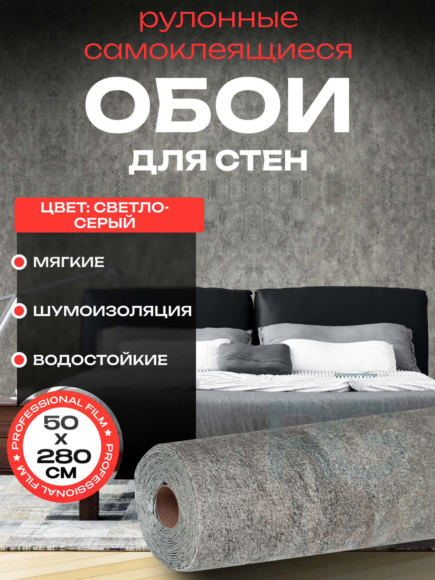 Обои в спальню. Обои самоклеющиеся для стен в рулоне для кухни 50х280 см цвет: светло-серые однотонные