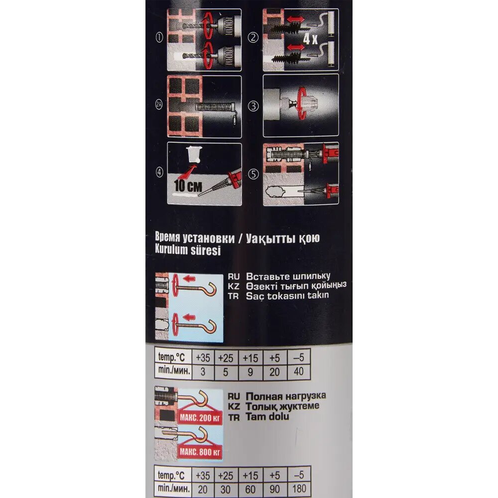 | Дополнительная информация | используется со стандартными пистолетами для герметиков, средство быстро схватывается; рабочее время: 2-18 мин, полное время отверждения: 20 минут (при температуре +25 °C); выдерживает весовые нагрузки до 800 кг |