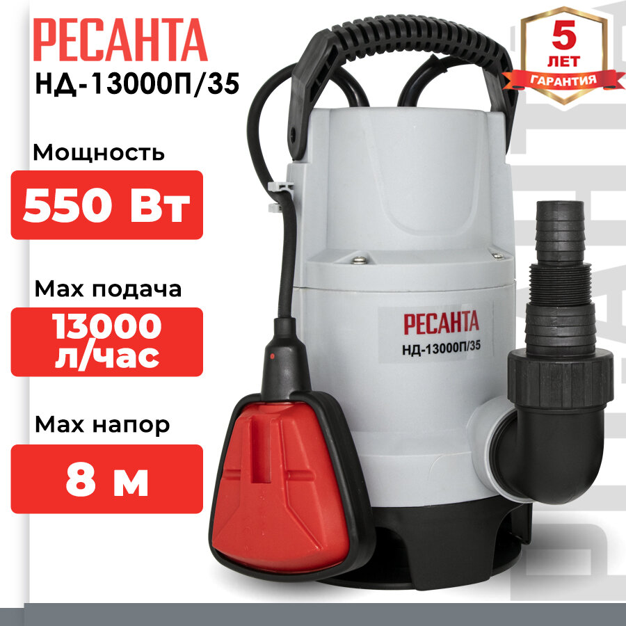 Купить Насос / Дренажный насос НД-13000П/35 Ресанта (550 Вт, макс. напор – 8 м, 13000 л/час, для грязной воды, диаметр пропускаемых частиц – 35 мм, 1.5“)