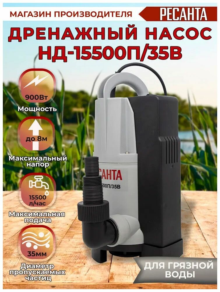 Насос дренажный погружной РЕСАНТА НД-15500П/35 для грязной воды (258 л/мин, с поплавковым выключателем) для откачки воды из водоемов, шахт, подвалов, помещений, бассейнов / для дома и дачи
