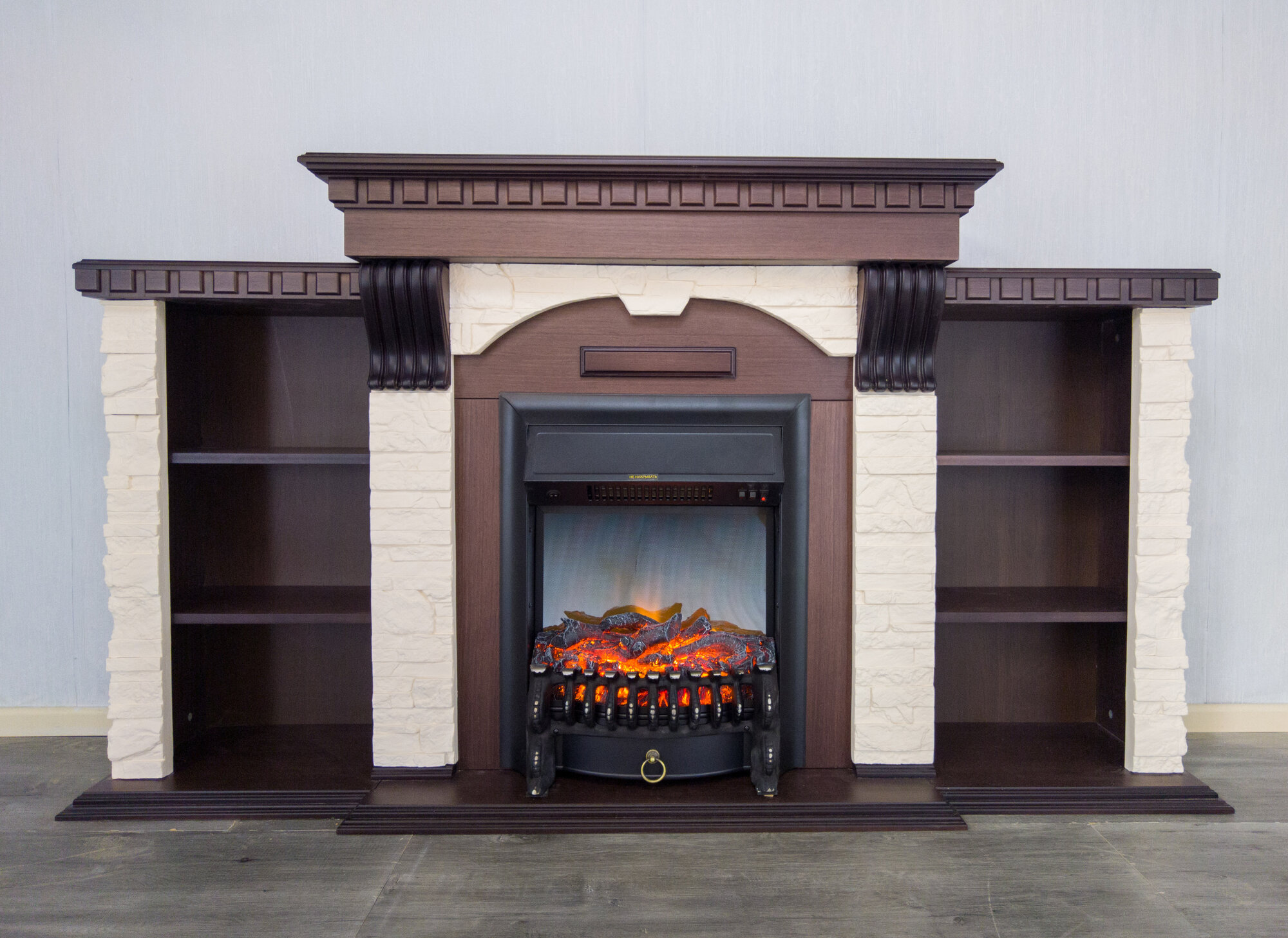 Электрокамин Дублин с тумбами очаг Fobos, орех, камень белый